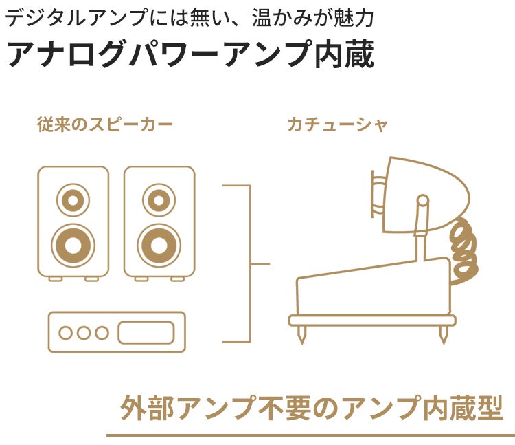 卓上Hi-Fiスピーカー「カチューシャ」は、再生装置から送られる音を増幅させるアンプ内蔵型。アンプは信号の処理方法によりアナログとデジタル、2種類に分けられます。それぞれに長所・短所がありますが、現在は、軽量・小型のデジタルが主流。