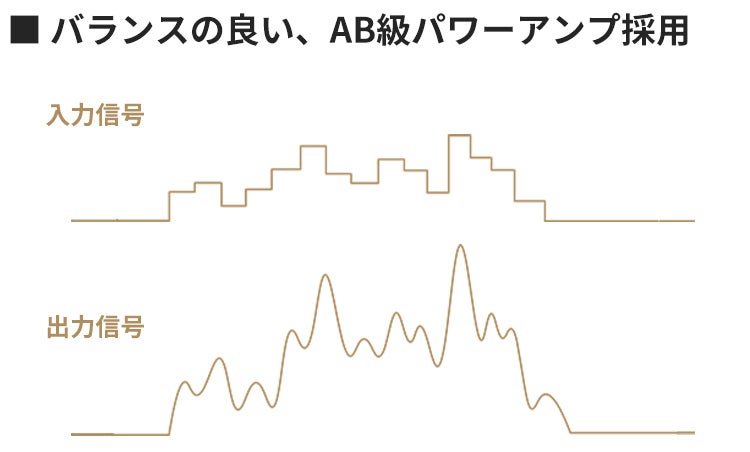 その良いところを合わせたものが、AB級アンプです。大音量でも小音量でも、安定した音を楽しむことが出来、バランスの良いAB級アンプは、「カチューシャ」をはじめ、様々な製品に採用されています。