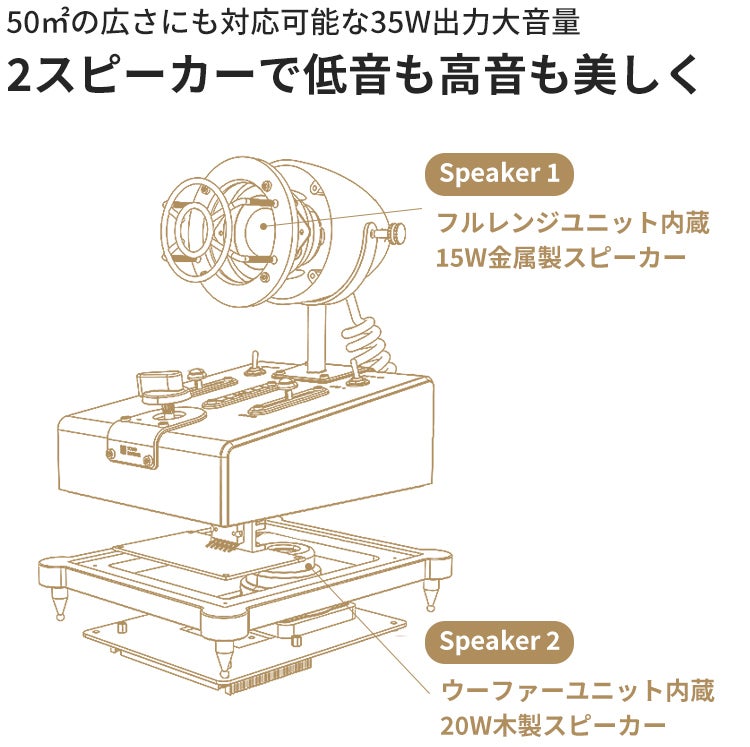 合計35W出力のハイパワー。出力音圧は100-110dB。コンパクトボディですが、50㎡の広い空間でも十分に音楽を楽しむことが出来る大音量も自慢です。