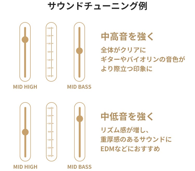 左のツマミでは中高音を、右のツマミでは中低音を、ともに±3dB調整可能。流れる音楽に合わせて、サウンドを自分好みに手軽に調整出来るのは嬉しいですね。