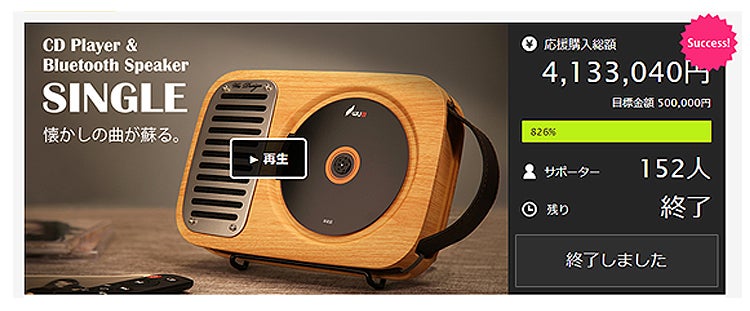 ▲Bluetooth対応CDプレーヤー「SINGLE」。2つのクラウドファンディングサイトで、合計600万円を超える支援を集めました!