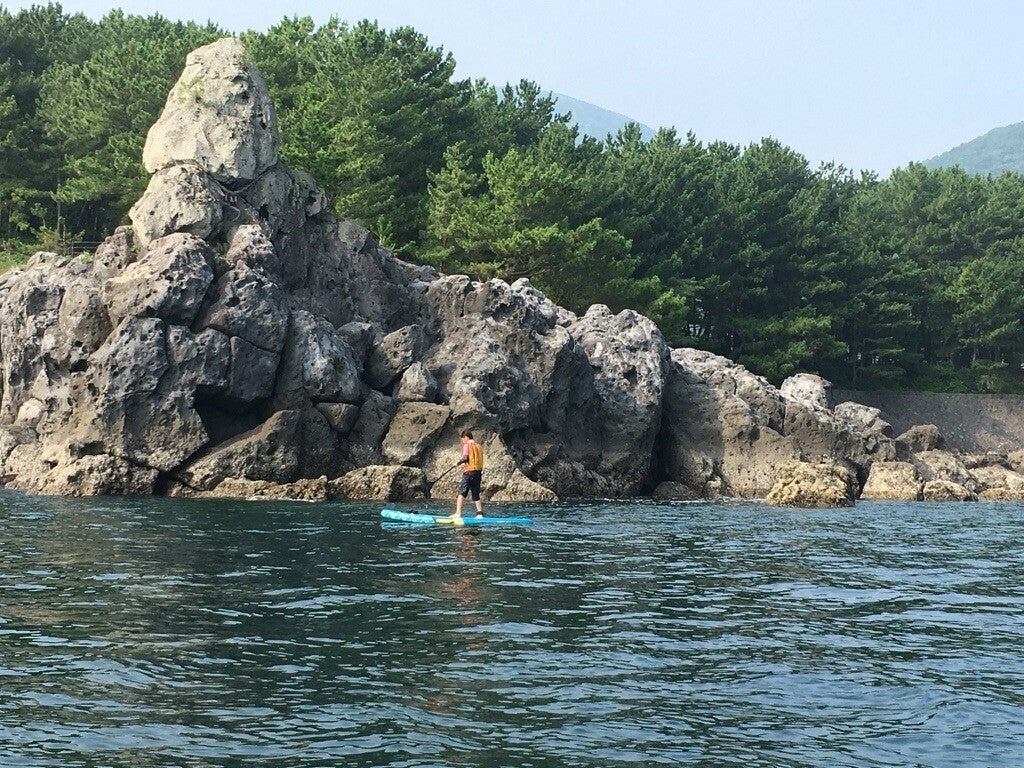 サップ体験では、小浜の綺麗な海を自由に散策しながら、富津弁天公園の崖の真横を通ったり、小浜温泉の景観を海上から眺めたりと、小浜の自然を楽しむことができます。