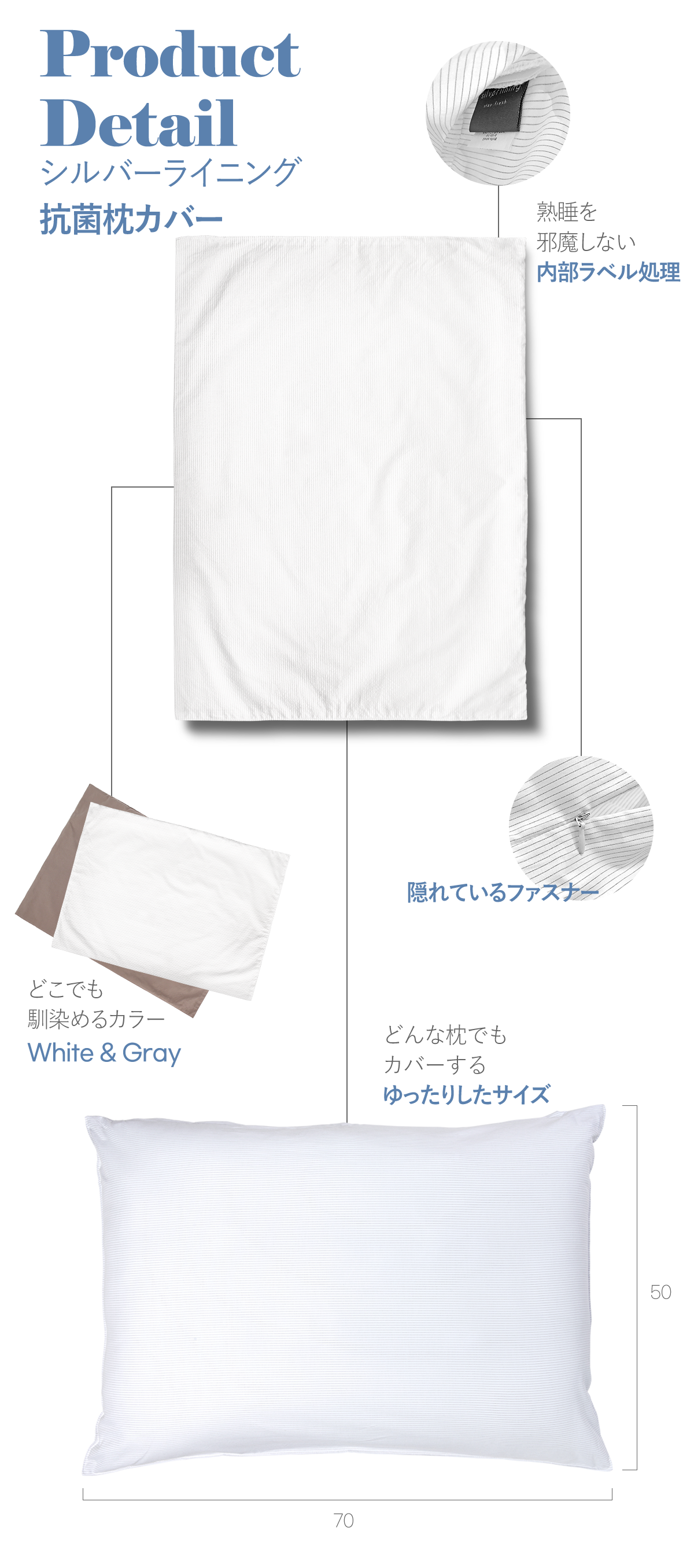 こんにちは、シルバーライニングです!みなさん、ご存知ですか? 肌トラブルの原因は、頻繁に洗濯していない枕カバーを数時間枕にして寝ることによって発生します。 そのため、専門家は少なくとも2日おきに枕カバーを洗濯するように勧めています。しかし、忙しい日々を過ごしてるなか、頻繁に洗濯できないですよね。 代わりに、毎日タオルを敷いて寝る方もいますよね。 でも、実は、、、タオルにはもっとたくさんの細菌がある事実!! ご存知でしたか?! タオルの特性上、洗濯しても完璧に汚れは落ちません。 埃や角質などが残留し、それらを食べて育つ細菌はまだ残っています。ですが、シルバーライニング抗菌枕カバーは細菌の増殖を99.9%防いでくれます。 3年間農薬を使用していない土壌から有機栽培方式で育てられた綿で制作されてますので、 残留農薬の心配もありません。 肌のトラブルが心配なら、もしくは気になってるならば、 今すぐ使っている枕にシルバーライニングの抗菌枕カバーを被せましょう。 もし、枕のサイズに合わない場合は枕にしいて使ってみてください! 敷いていただいても、横70cm、縦50cmのゆったりしたサイズで、 お使いの枕をカバーするには十分なサイズです。 シルバーライニングは、皆さんのクリーンな日常を応援します。