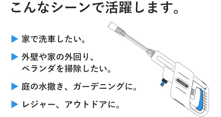 電源環境が近くに無くても使用できる点が、充電式最大のメリット。使用場所に制限が無く、駐車場でも、広場でも、お好きな場所で洗車して頂けます。
