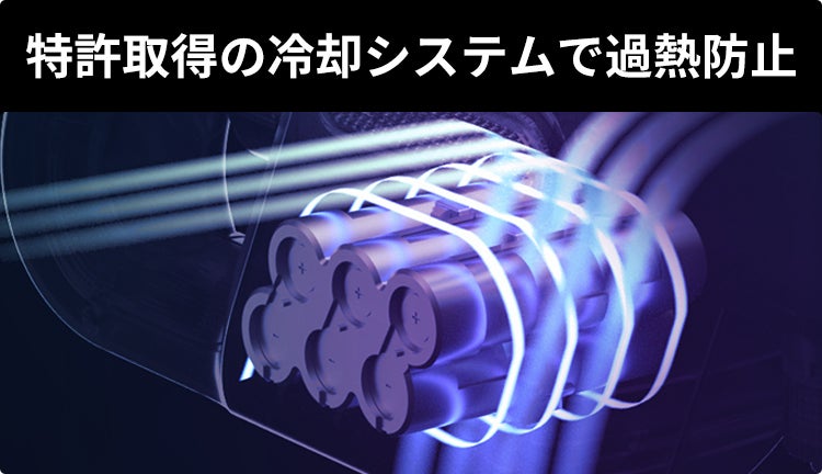 モーターの稼働で生み出される風の流れを冷却システムに用いる、中国での特許取得技術※で、本体の過熱を防止し、バッテリーの寿命を延ばすことにも成功しました。