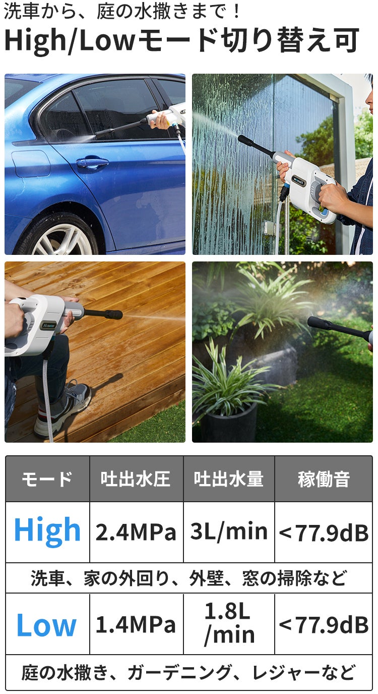 洗車、お家の外壁や外回りの掃除にはHighモード、庭の水撒き、ガーデニングにはLowモードがおすすめです。