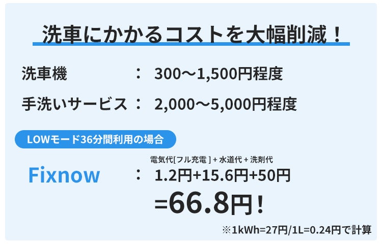 洗車機や洗車サービスだと、コストがかさみますが、「Fixnow」を使えば、1回の洗車がこんなにローコストに!お財布にも優しいんです♪