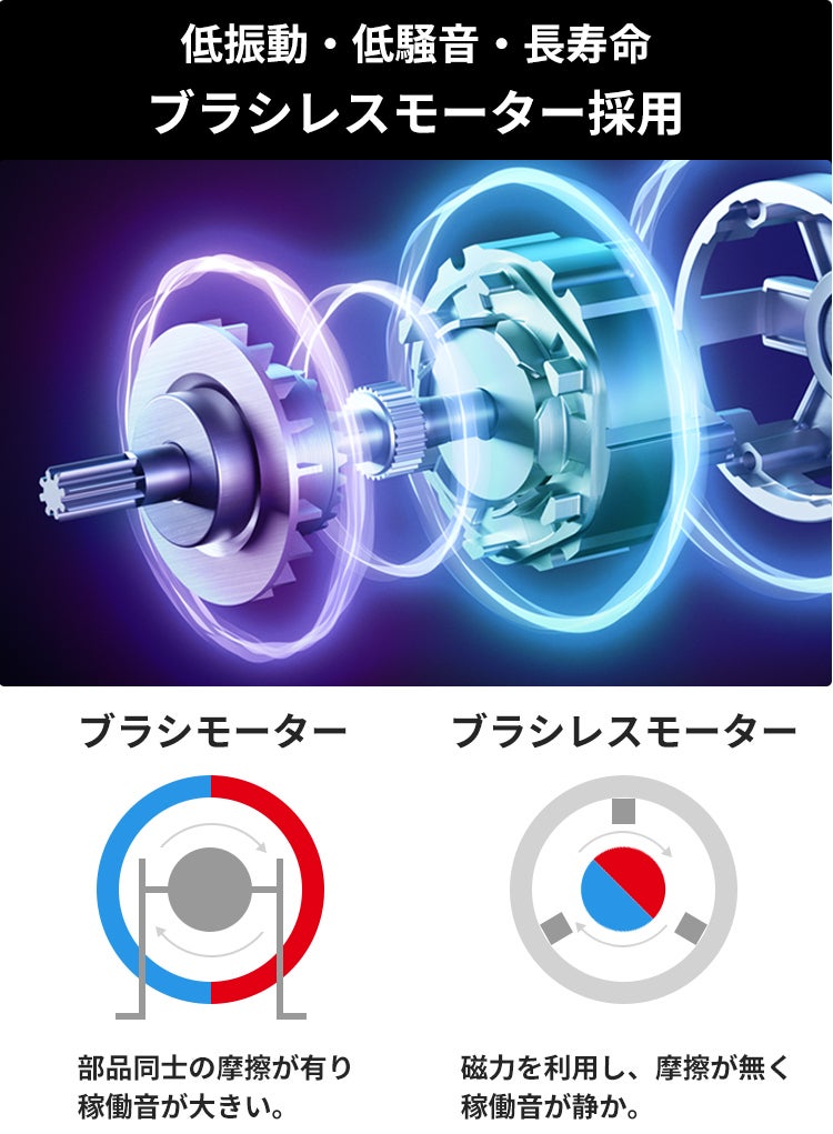 モーターパーツには、ネオジウム磁石(38SH)を使用。トルク数が大幅に向上。安定性を高め、本体の振動を軽減しています。※2~3m/s2