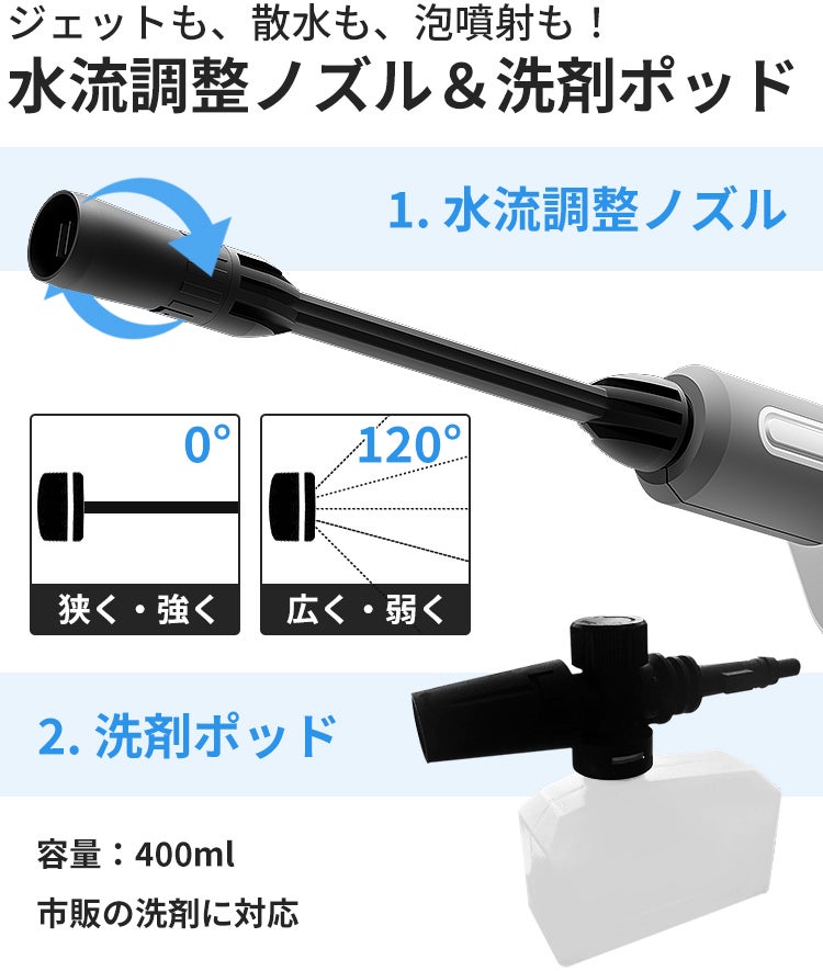 ▲洗剤ポッドノズルは洗車時に便利。洗剤ポッドに適量洗剤を入れ、ハンドルを握ると、泡が噴射されます。