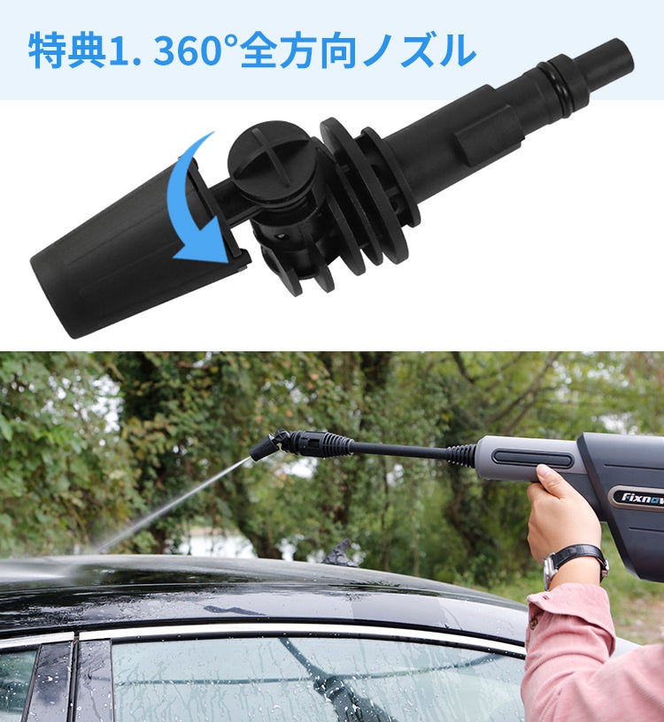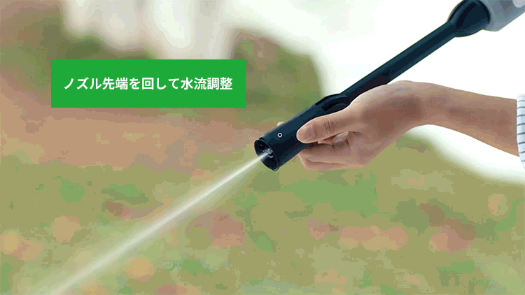 こちらは、360°全方向に水の向きを変えられるノズル。例えば、腰を屈めないと掃除が難しい車のボディの底部や、隙間の掃除にぴったりです。