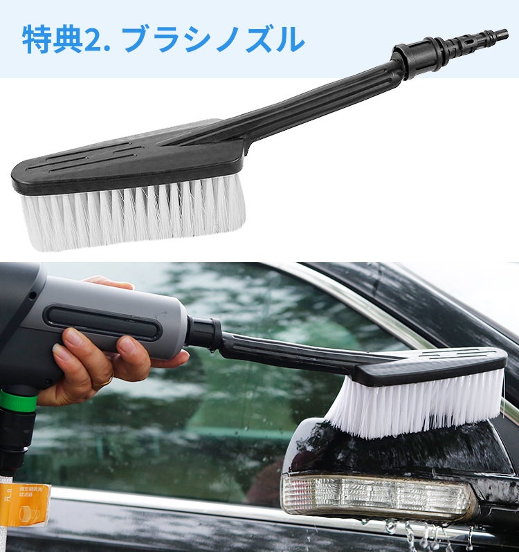ホイールやタイヤに付いた泥汚れ、床のタイルなど、ゴシゴシ洗いをしたい時に便利なブラシノズル。
