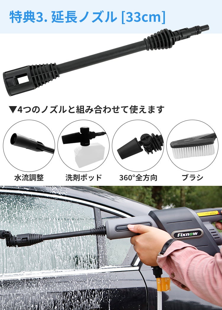 33cmの延長ノズル。他のノズルと組み合わせて使用します。水流調整ノズル、洗剤ポッド、360°全方向ノズル、ブラシノズルと一緒に使用頂けます。手が届きにくい場所や、車の上部の洗浄に便利!