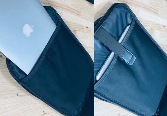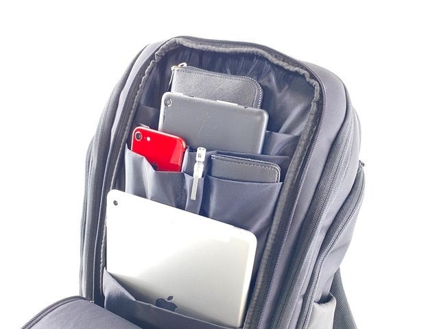 タブレットやノート、文具などを複数のポケットでコンパクトに収納
