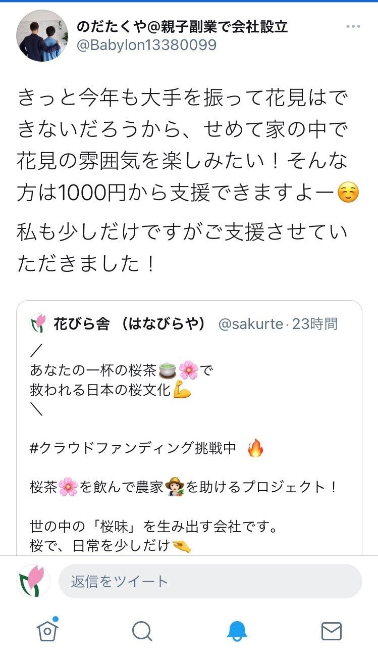 ご支援頂いた方に、ご自身のSNSアカウントで本プロジェクトをご紹介頂きました!こうやって広めて頂けるなんて、本当に有難い限りです。。。改めて、身が引き締まる思いです!残り期間32日!皆さま、引き続き宜しくお願い致しますm(__)m