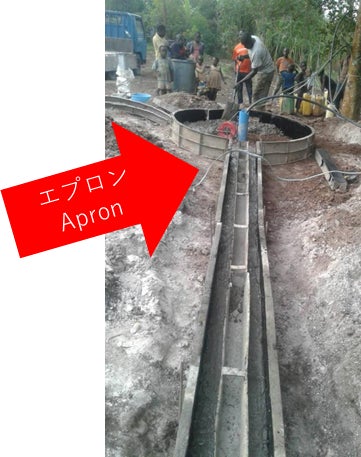 井戸を使って周囲が泥だらけになることを防ぎ、余った水が地下水を汚さないよう水を遠くに運ぶために、井戸の周囲にエプロンというコンクリート部分を設置します。