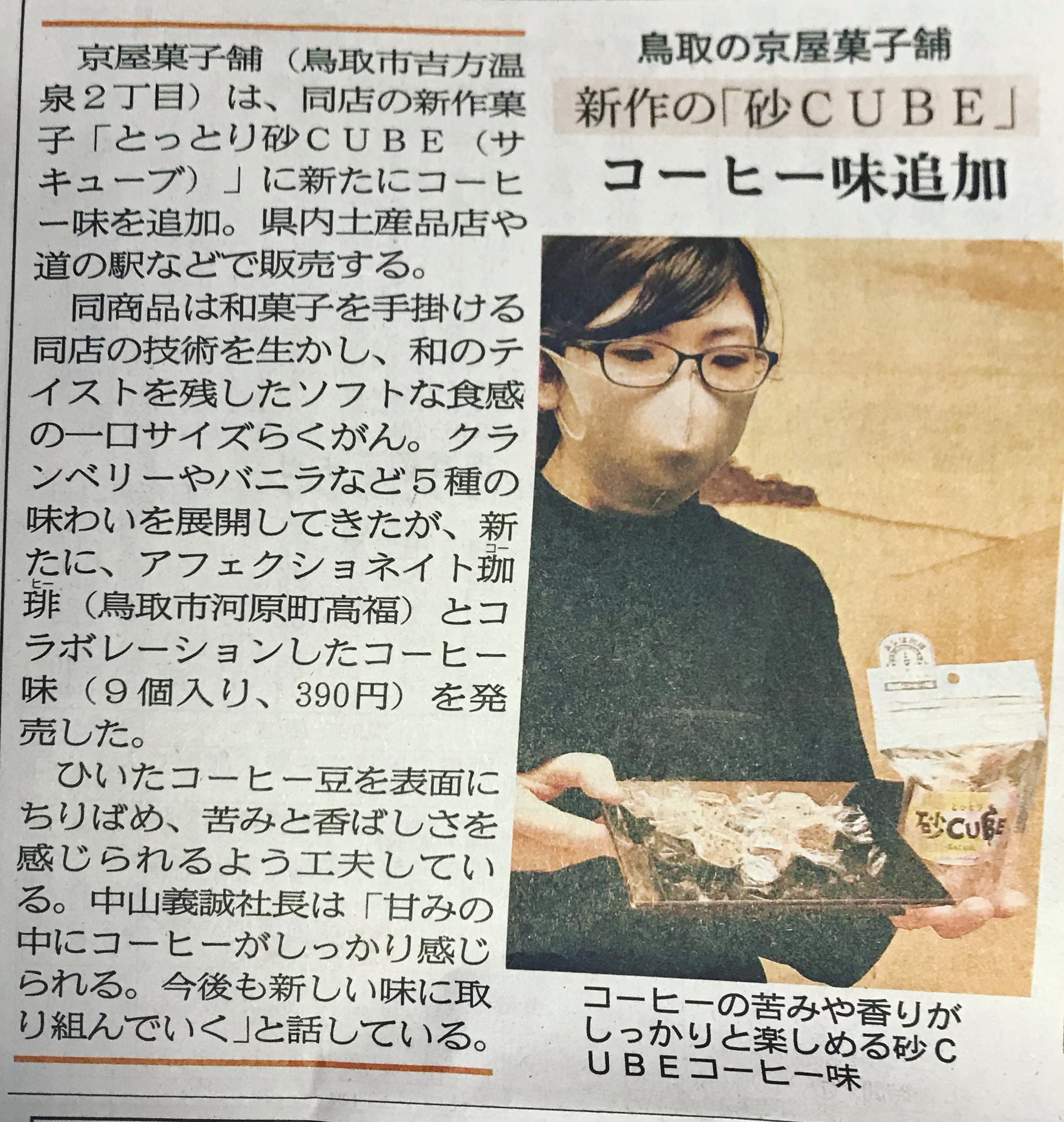 たくさんの皆様からのご支援、ありがとうございます。2月1日の日本海新聞に、昨年末発売した【砂CUBE珈琲味】の記事が掲載されました。コーヒーのおいしさ、らくがんのおいしさ両方が伝わる商品になったと思っています。皆さんに伝わればいーな♪