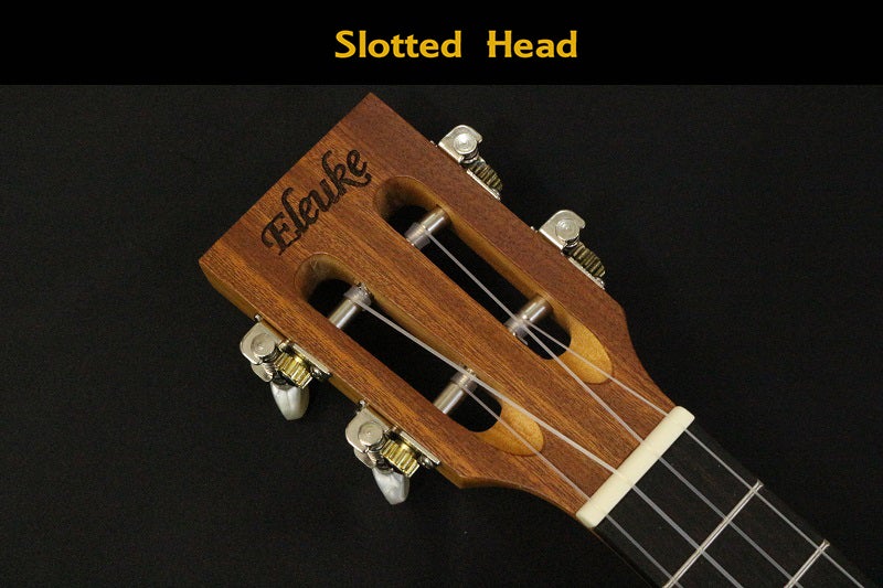 ナットからブリッジまでの距離350mmでEleUkeの中で最も短く、サイズが小さくなります。ウクレレ弦メーカーによって弦の太さが少しずつ違いが有りますが、ソプラノ、コンサート、テナー弦の太さがほぼ似ている太さの弦に同じチューニングをすると弦の長さが最も短く、張力(テンション)が弱いので運指をしたとき、指の痛みに負担が少なくソプラノ( ?)というサイズが与える先入観よりも音が柔らかいです。フレットの間の間隔が最も狭いので、小さな手を持っている人に適しています。