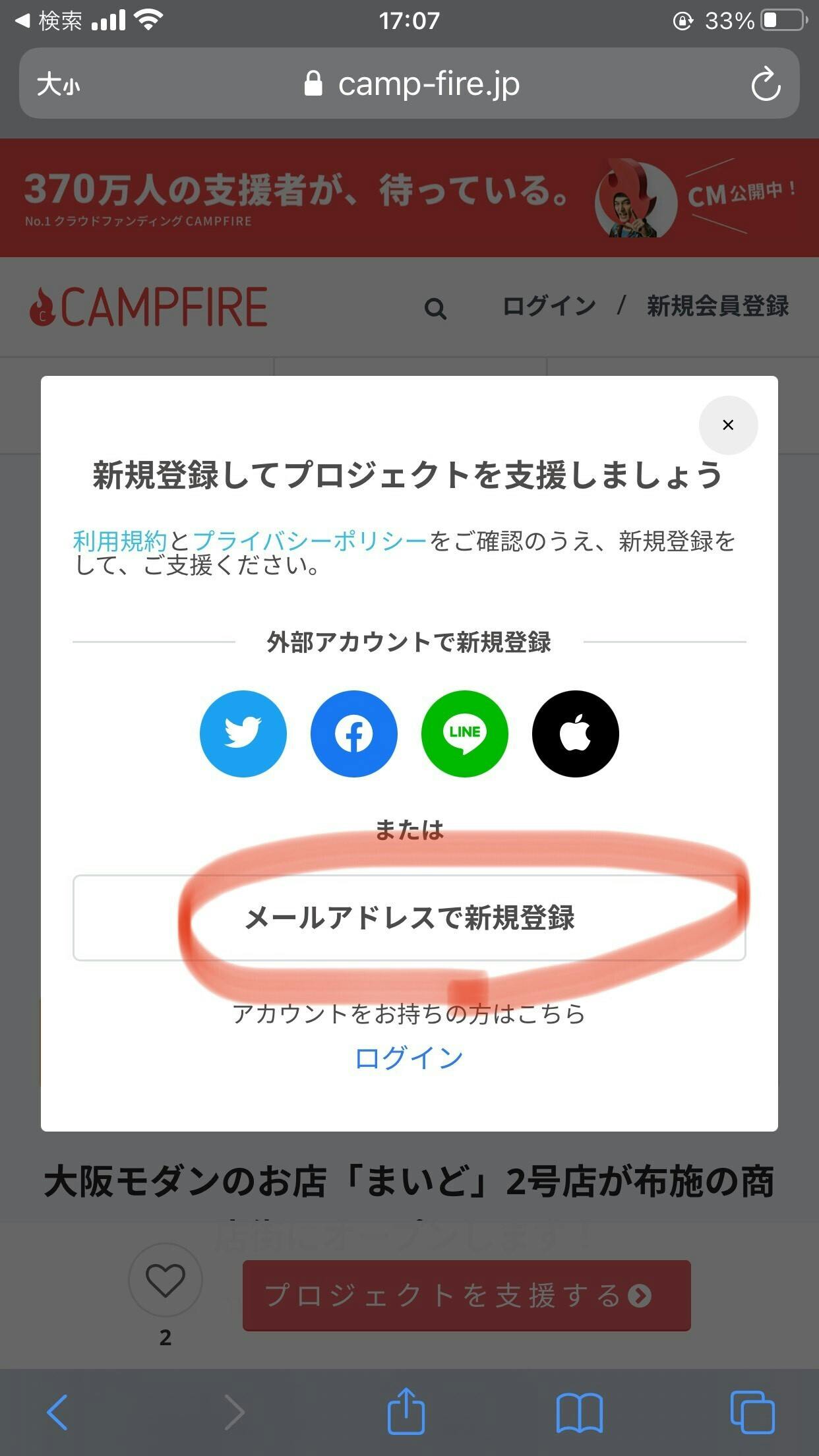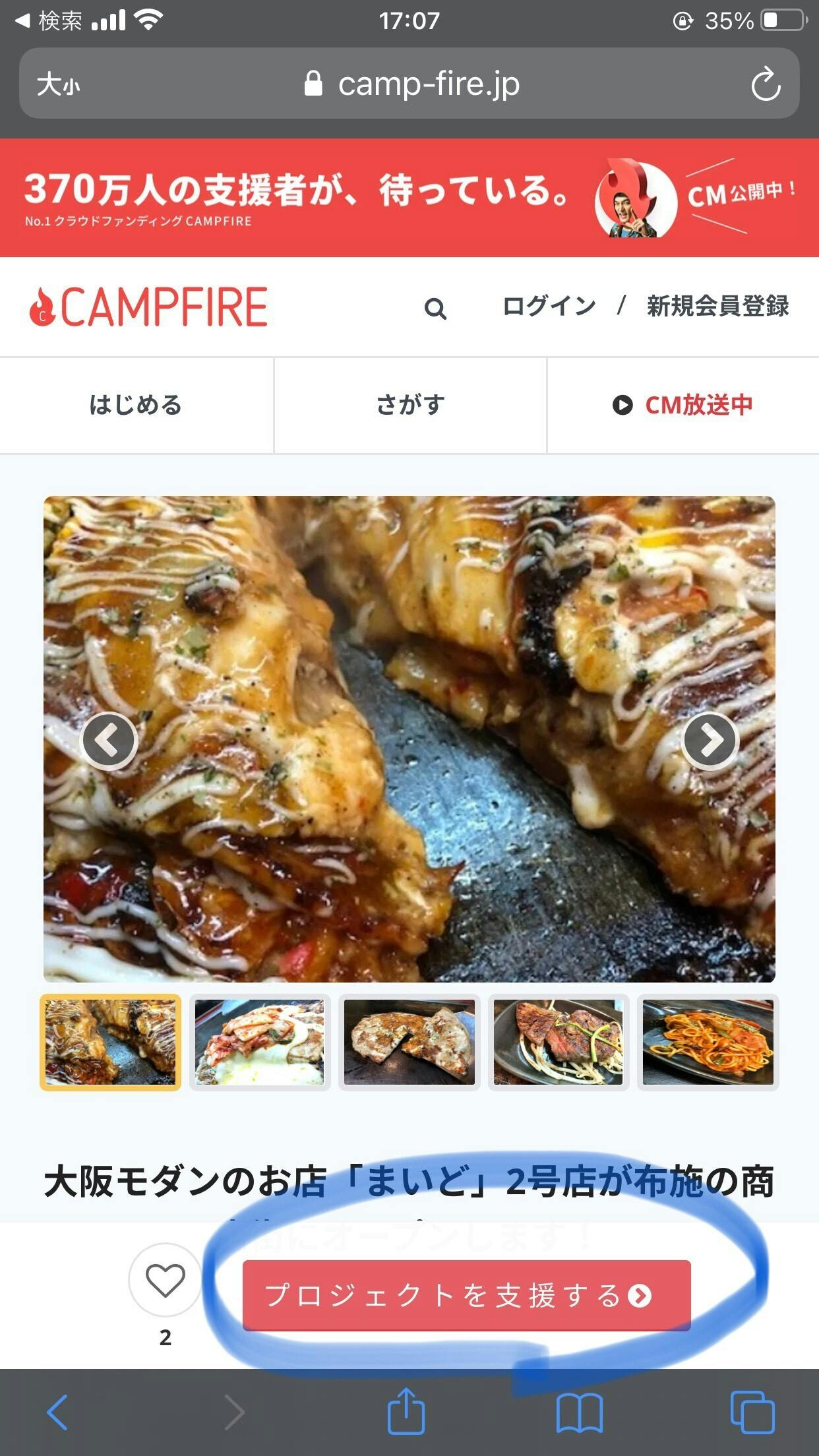 ①キャンプファイヤー内のまいどのページで「プロジェクトを支援する」を選択する。