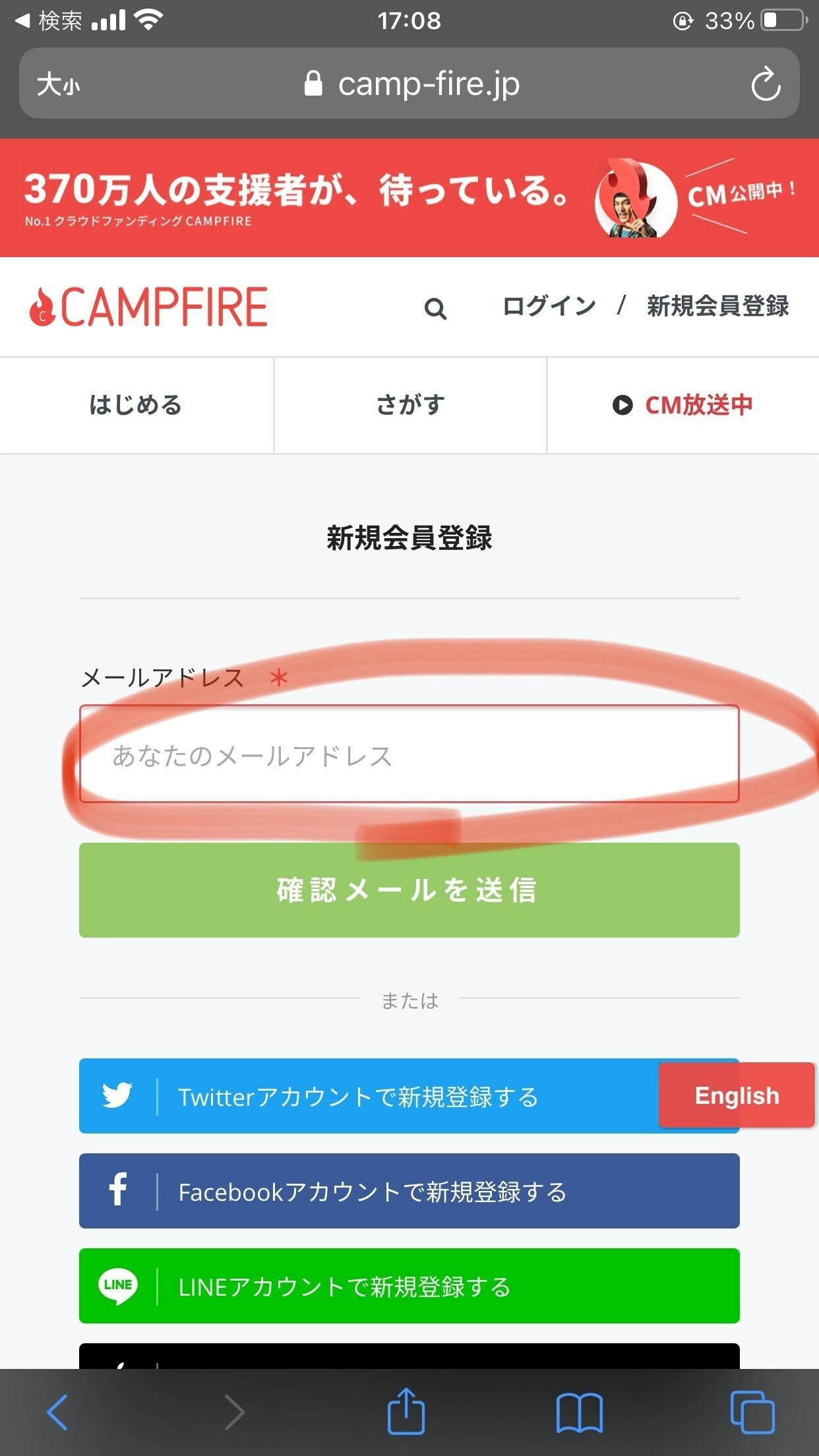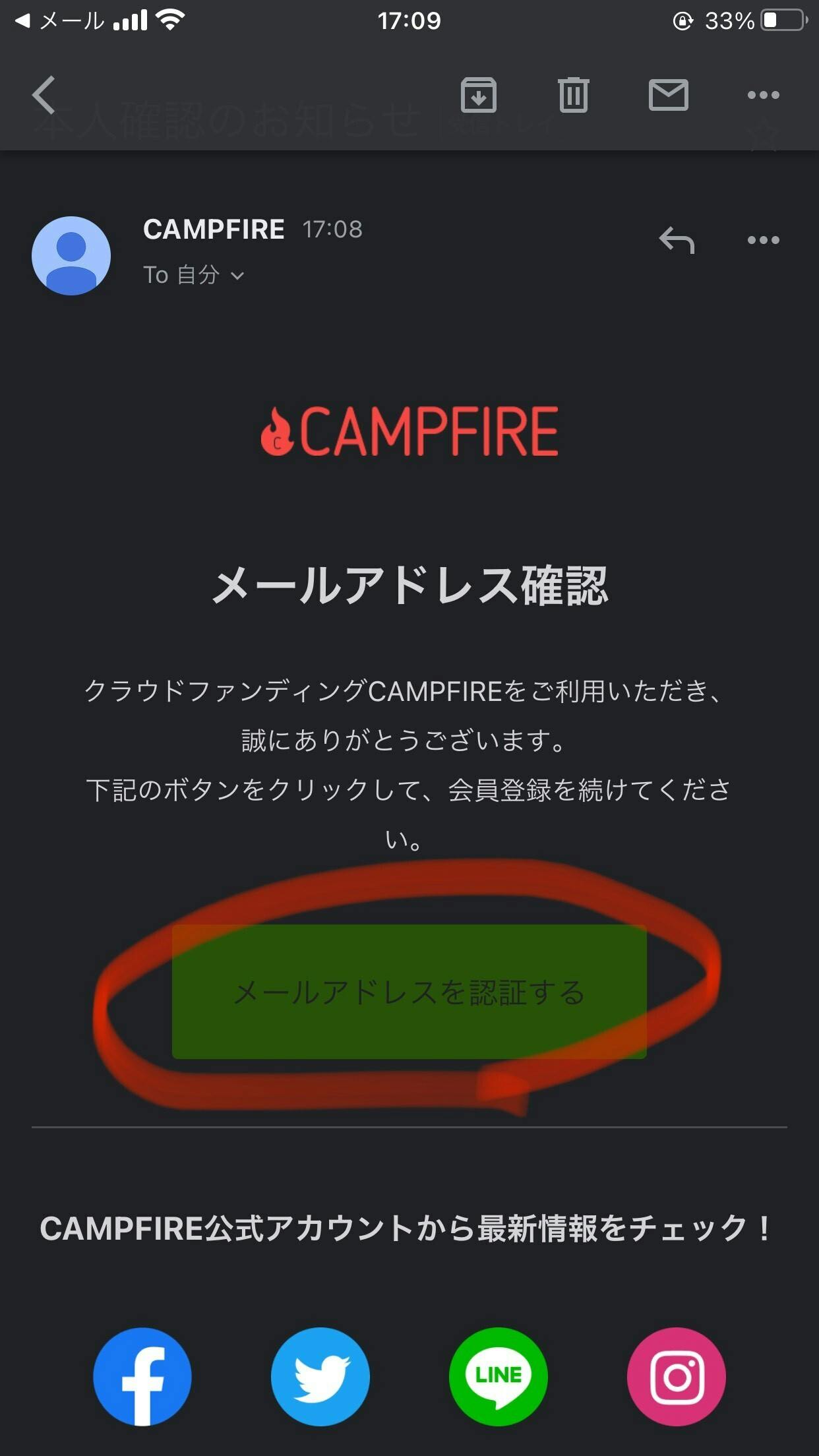 ④メールにキャンプファイヤーから確認メールが届くので「メールアドレスを確認する」をクリックまたはタップ
