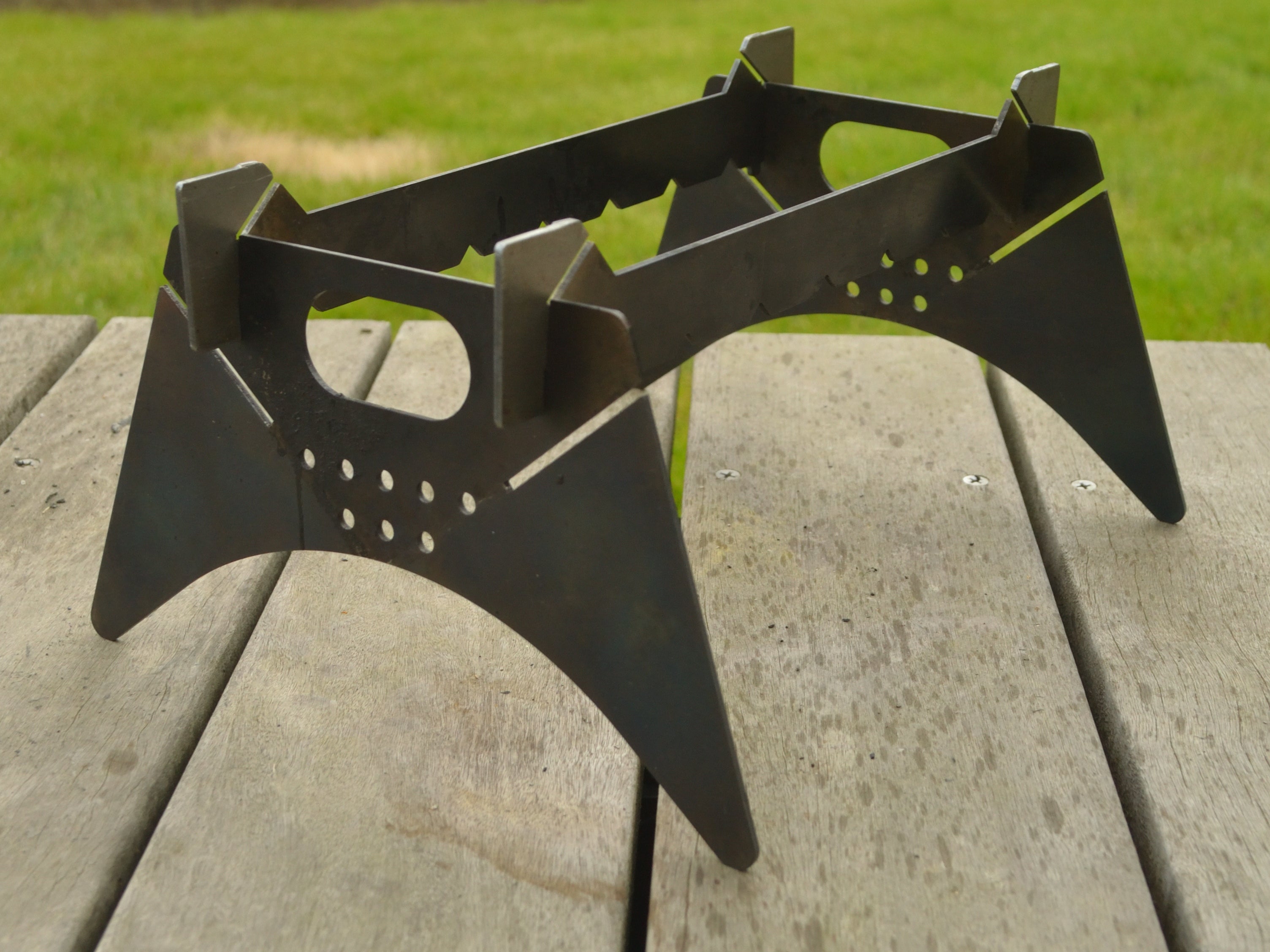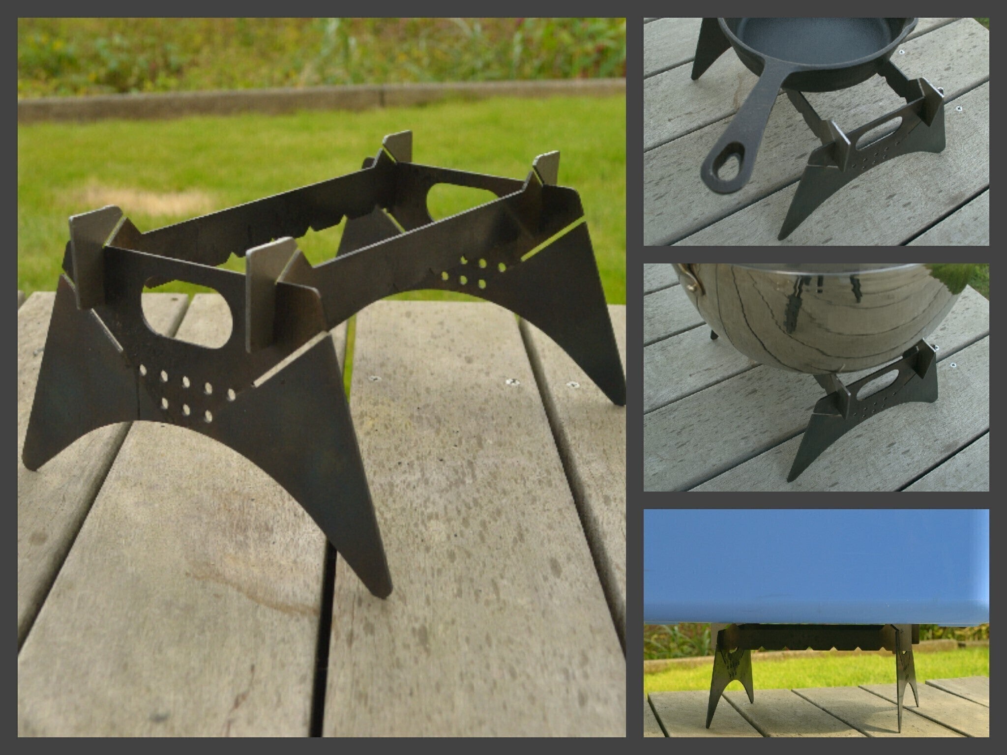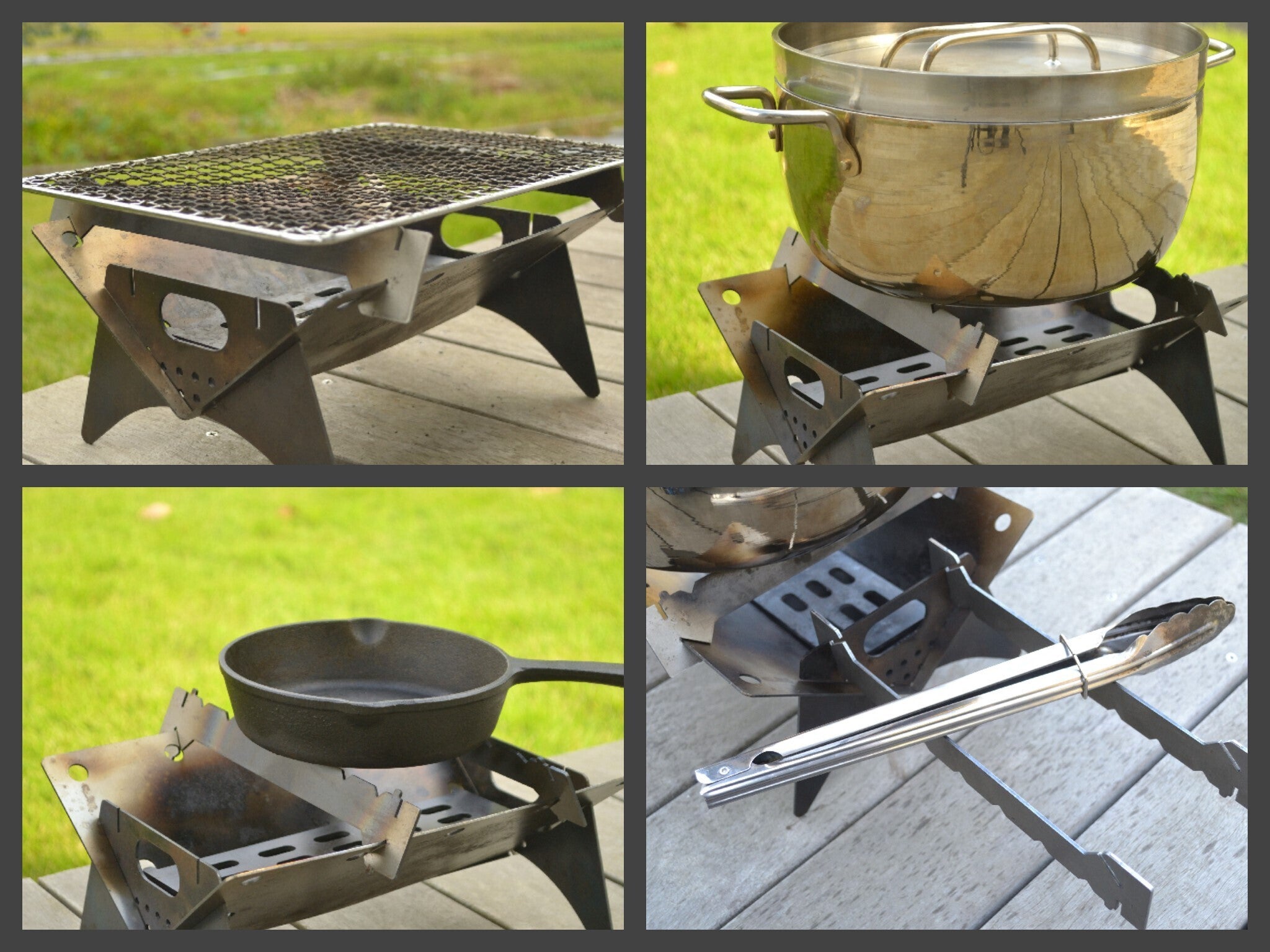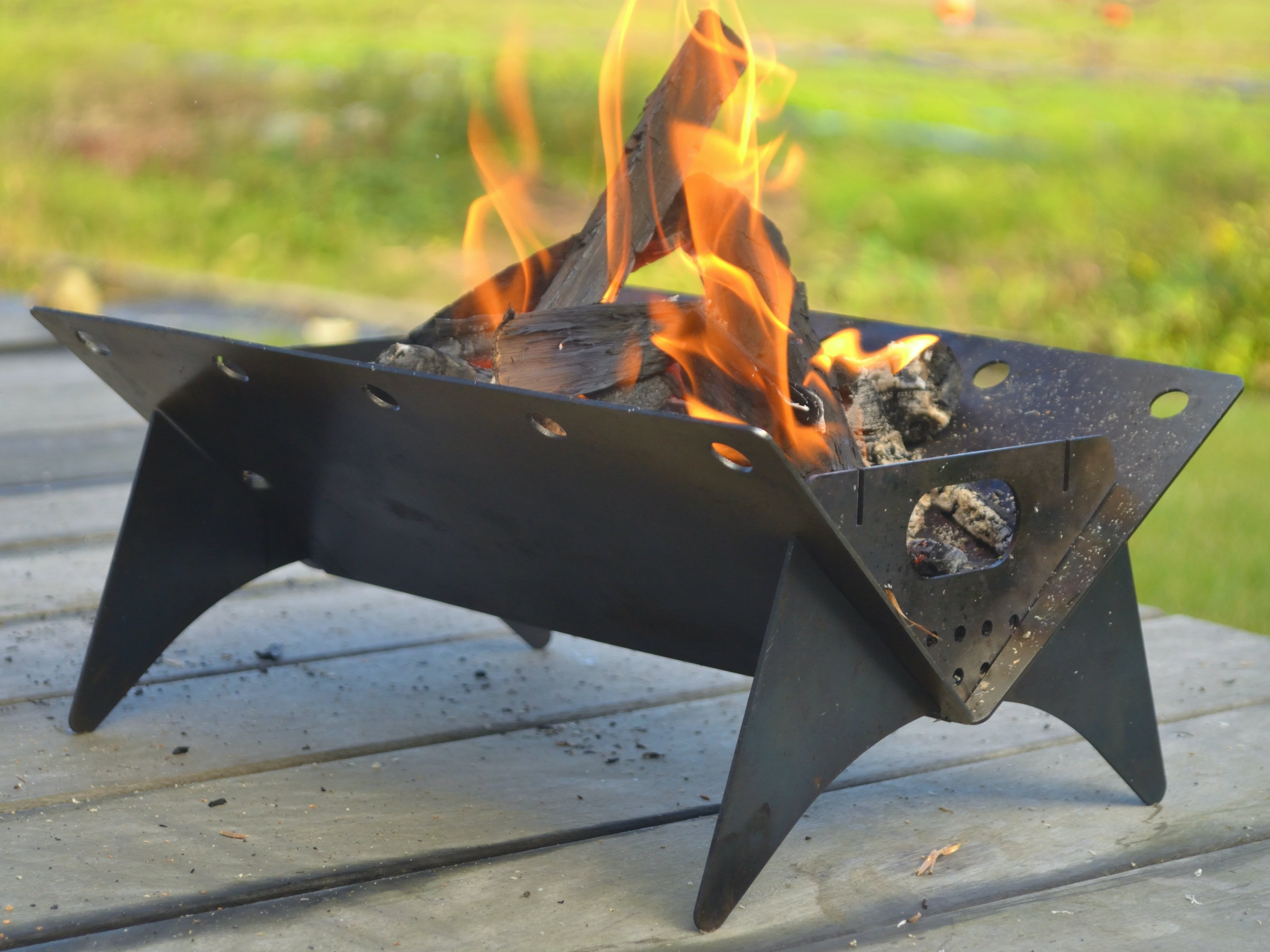 すべてのパーツを厚さ2mmの鉄板で製作、シンプルなデザインで無骨なキャンプにマッチする焚き火台です。また、焚き火台のみの用途ではもったいないと考え、パーツの組み変えでスタンドとしても使えるように開発しました。