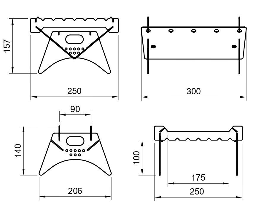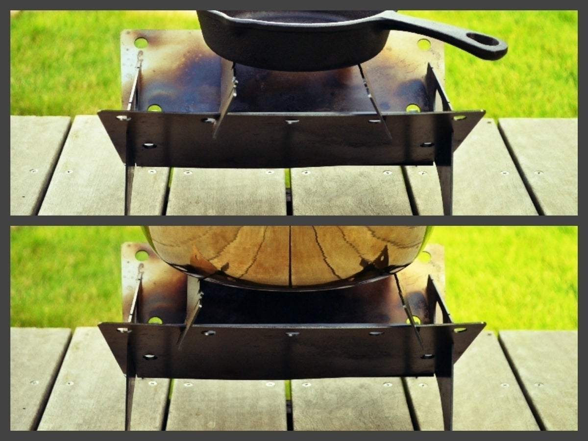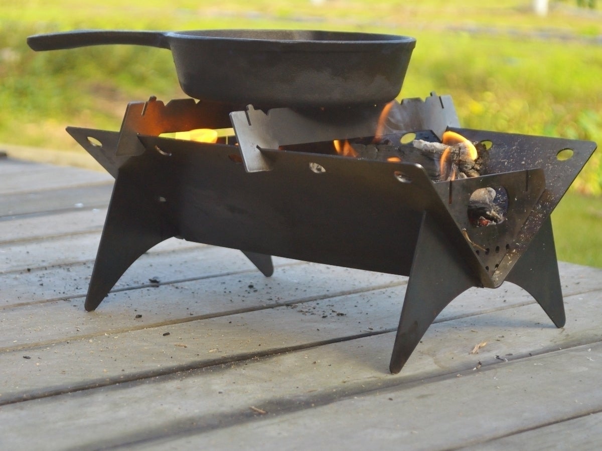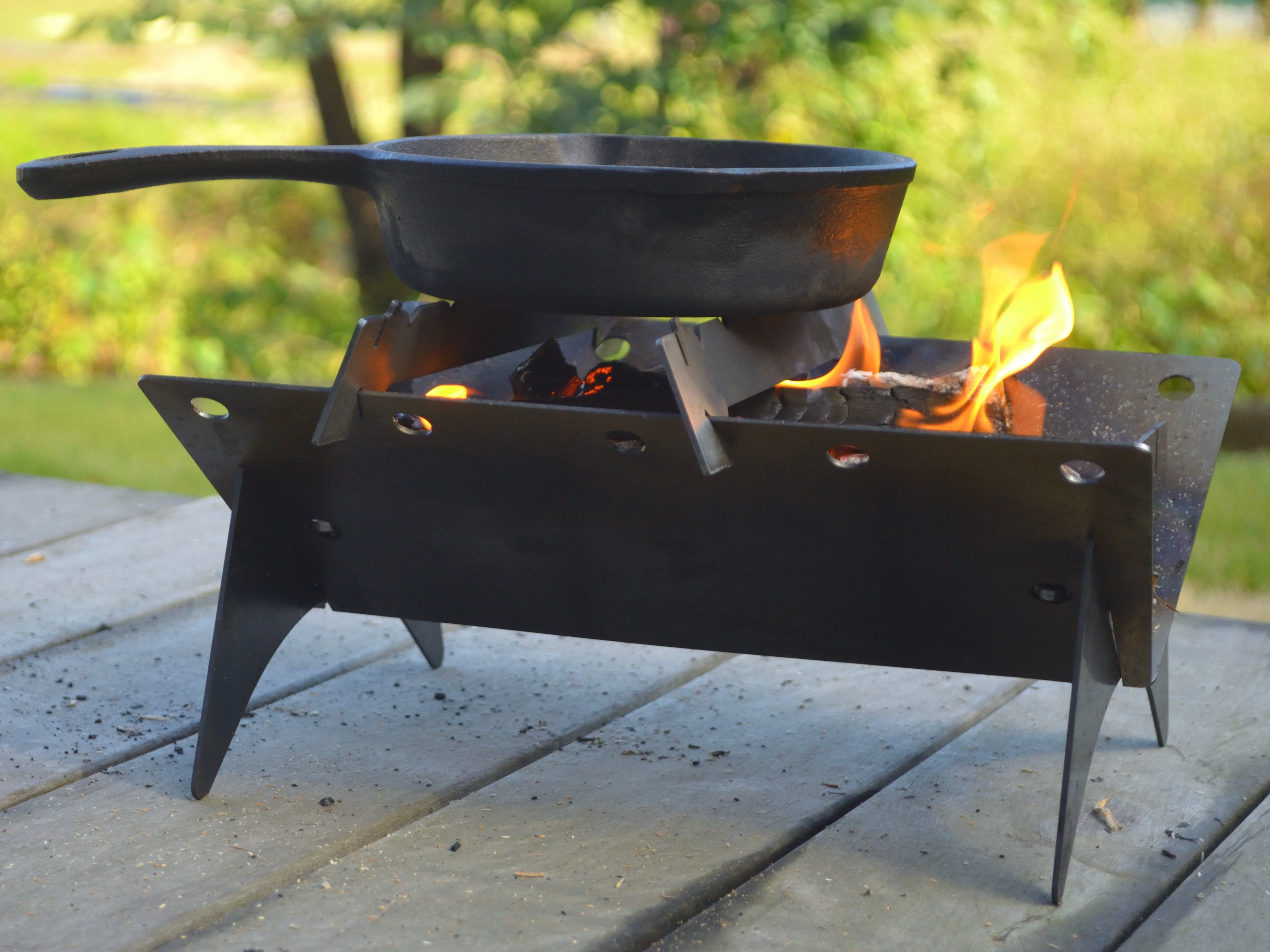 すべてのパーツを厚さ2mmの鉄板で製作、シンプルなデザインで無骨なキャンプにマッチする焚き火台です。また、焚き火台のみの用途ではもったいないと考え、パーツの組み変えでスタンドとしても使えるように開発しました。