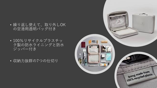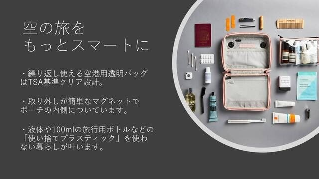 ・繰り返し使えて、取り外しOKの空港用透明バッグ付き