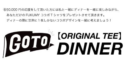 ⑧50,000円の応援をして頂いた方には私と一緒にディナーを一緒に楽しみながら、あなただけのFUKUMYコラボTシャツのデザインを一緒に考えさせて頂き、後日発送で提供させて頂きます!