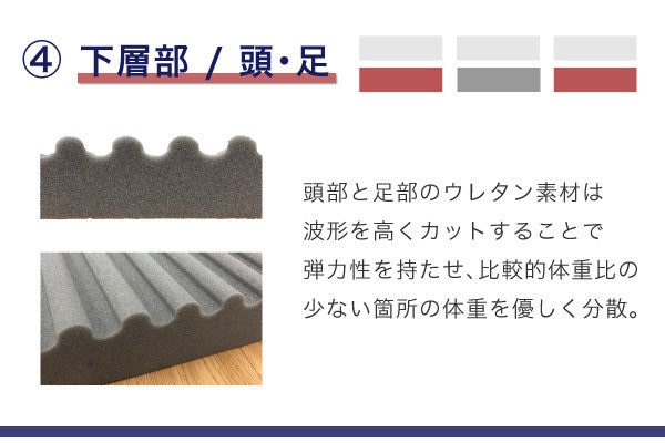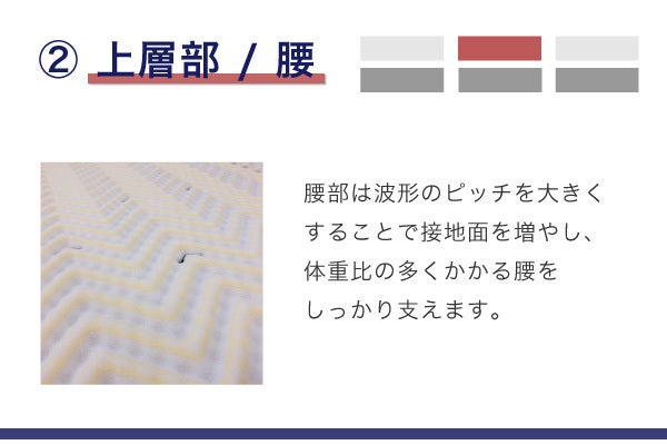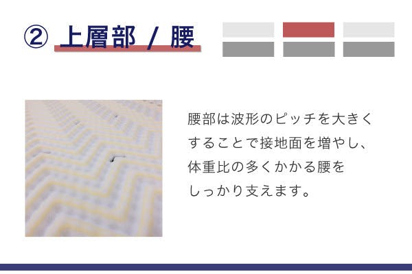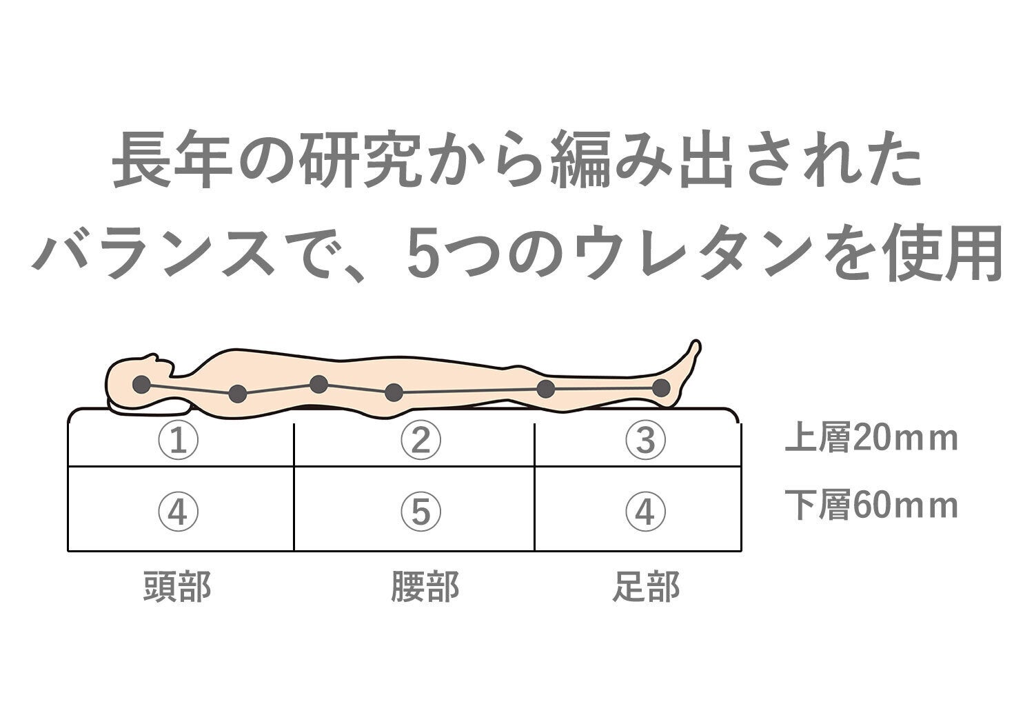 →この5つの組み合わせが、正しい S 字カーブをキープでき、腰をしっかりサポートするマットレスを作り出します。