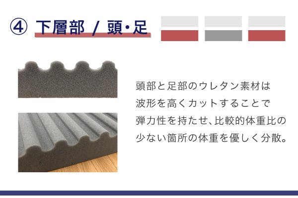 ●下層はウレタンフォーム(スーパーハードタイプ)で作られており、上層を点で支え、背中とおしりの沈み込みを防ぎ最適の状態に保ちます。