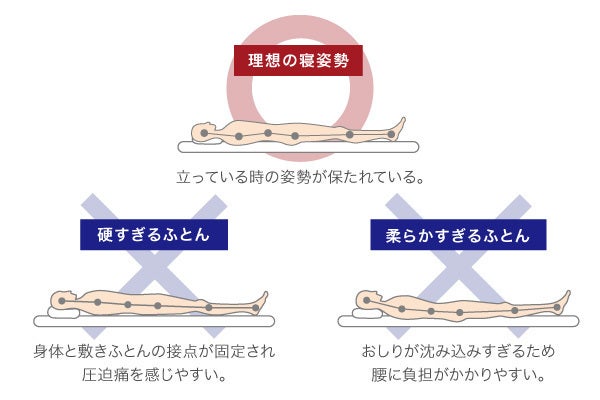 古田土氏: いえ、たんに硬ければいいというわけではありません。たとえば床に直接寝ると、体の接地部分に圧力がかかりすぎて、血行を妨げてしまうのは想像できますよね?このように、硬いながらも体の各部位の体重をやさしく受け止めるバランスの取れたマットが最も腰痛に良いといえるでしょう。