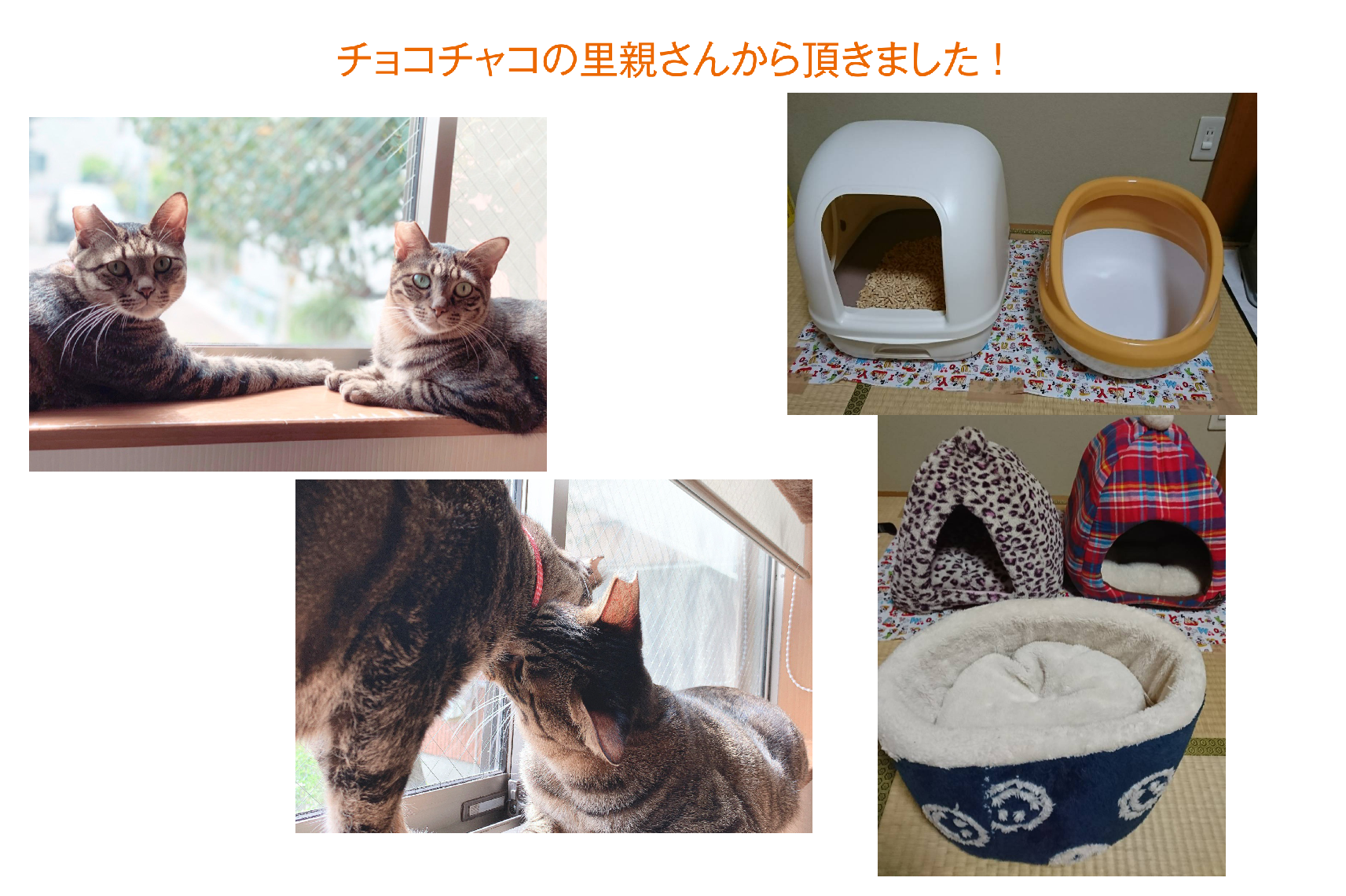支援物資はネコちゃん達のおトイレ2つとベッドを3つも頂きました!
