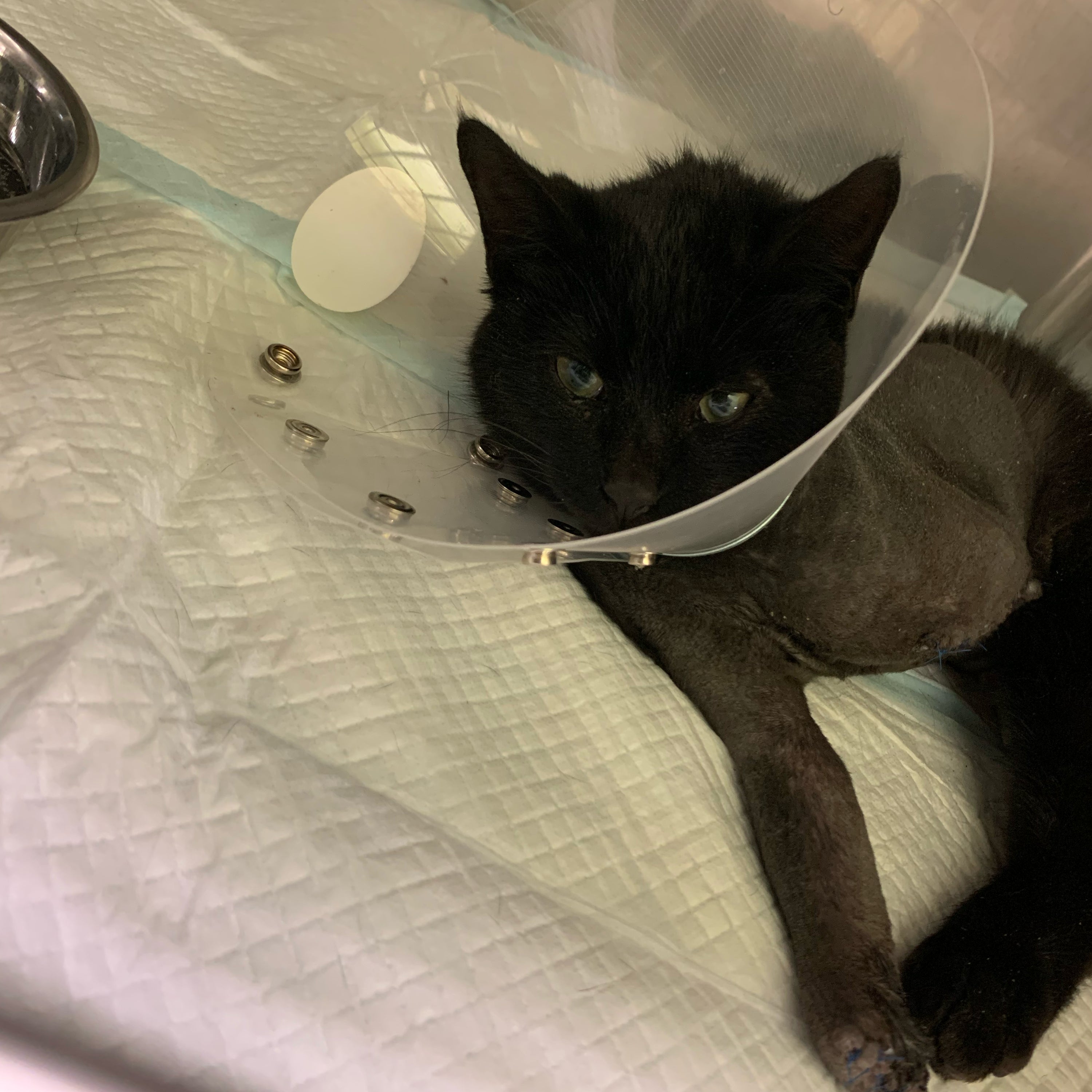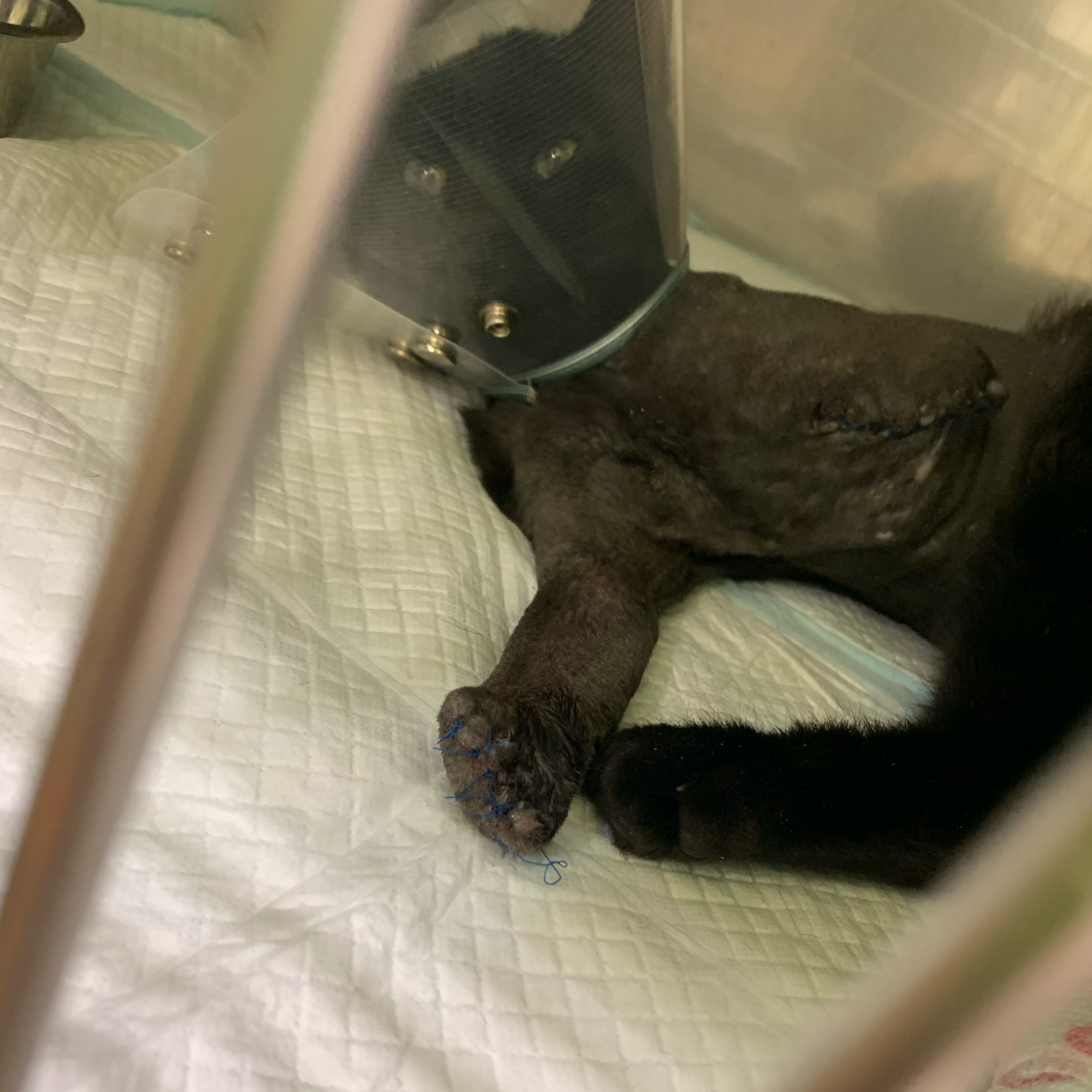 診察を受け、両前足の切断。そして後足も片方が折れおり現在ピンをいれ骨がくっつけばそのままくっつかなければこちらも切断となります。