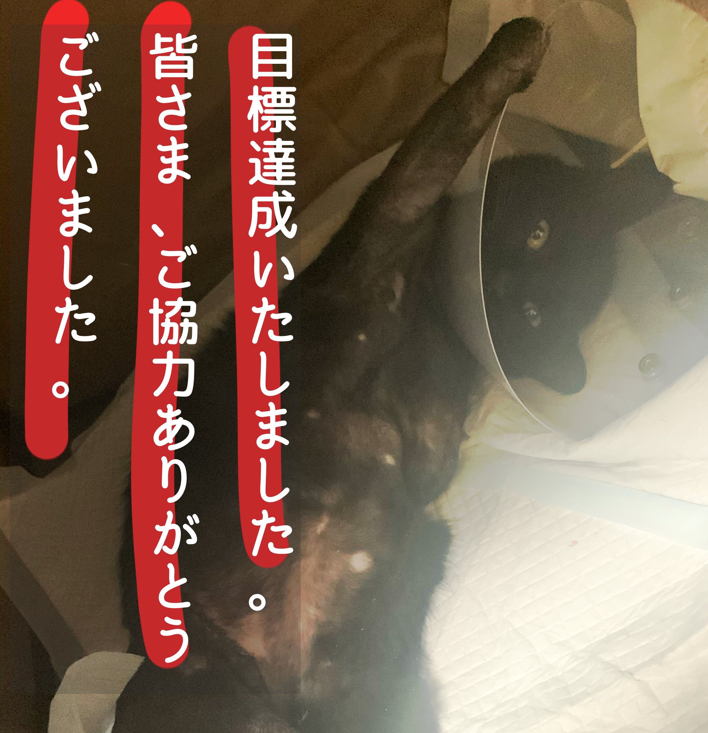 改めまして、ご報告です。先日、目標を無事達成することができました。これも、ご協力いただいた皆様のおかげです。これにてこちらの企画は勝手ながらにストップをかけさせていただきたいと思います。もしニュースやTwitterを見て支援をしようと思っていただけた方には申し訳ありません。大変心苦しいお願いにはなりますがよろしければ大和以外の苦しんでいる子たちにもご支援頂ければ幸いです。今後、ご支援いただきました資金は大和の医療費そしてまた未定ではございますが今後義足や車椅子を作る際に使わせていただきます。予想を遥かに超える支援をしていただき、150万を超えました。今回このクラウドファンディングを通じまして改めて人間の温かみを知ることができました。大和はまだ立つことも大変そうではありますが立って移動したりご飯を食べたりと回復をしてきています。今後も大和に様子をこちらとTwitterの方でして参りますので温かい目で見守っていただけたら幸いです。