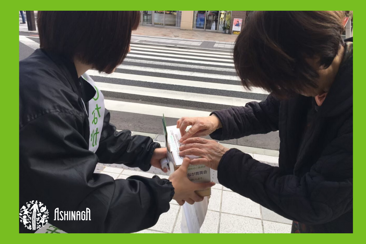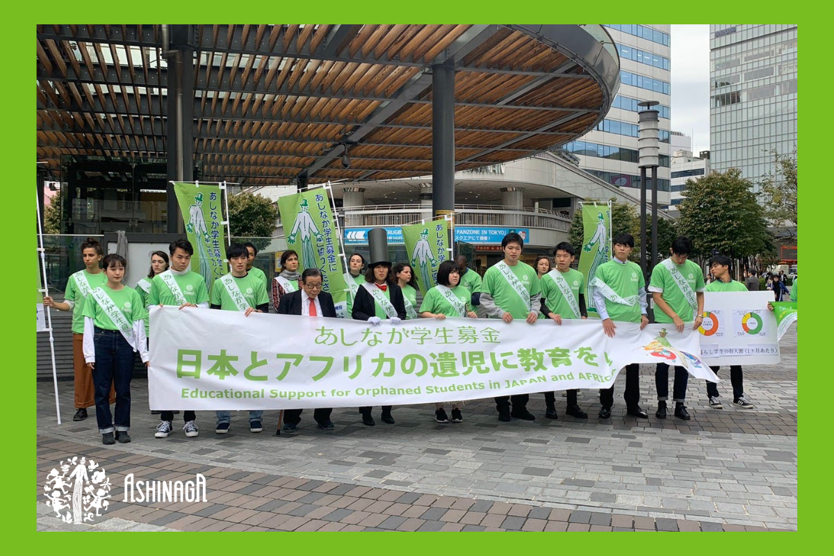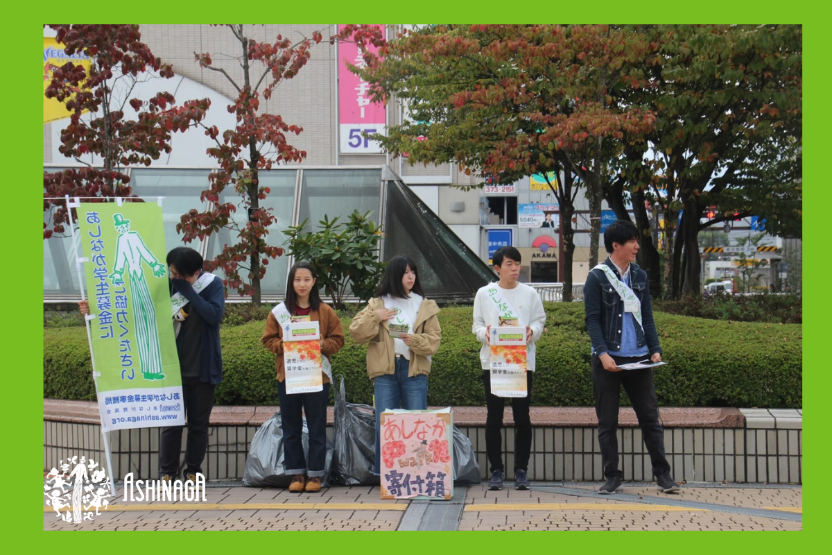 あしなが学生募金事務局は、企画・運営を学生で行い毎年春、秋の2回全国約200か所にて全国一斉に街頭募金を行っています。この街頭募金で集めたご寄付は全額をあしなが育英会に寄付し、日本とアフリカの病気や災害、自死(自殺)などで親を亡くした子どもたちや、障がいなどにより親が働けない家庭の子どもたちの奨学金として使用しています。