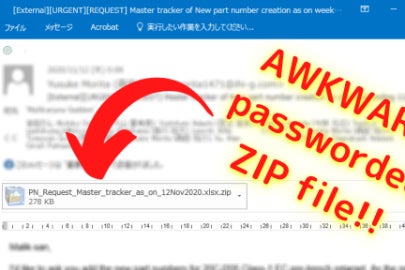 一方、この行為が情報セキュリティ上無意味であり、むしろ弊害となることは以前から知られています。ファイルにパスワードをかけて送付したとしても、同じ経路を伝いパスワードも送っているのです。情報を盗み取ろうとする側からすると、こんな容易なことはありません。ある意見では、メールを2通に分けることで宛先間違いを防ぐメリットがある、と言われる場合もあります。ただし、2通目の宛先は1通目からコピーペーストしますし、さらに自動化ソフトが出回っており、人的ミスを防ぐメリットはほぼありません。
