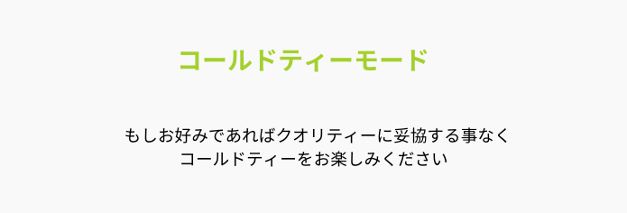 お茶が飲める温度に冷めるのを待ちたくないときのために、マシンは少量の紅茶をいれてカップに分配し、さらにタンクから適量の冷水を加えて、温度を下げます。