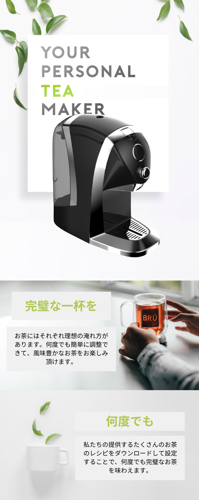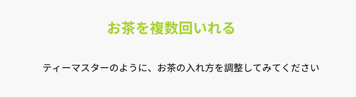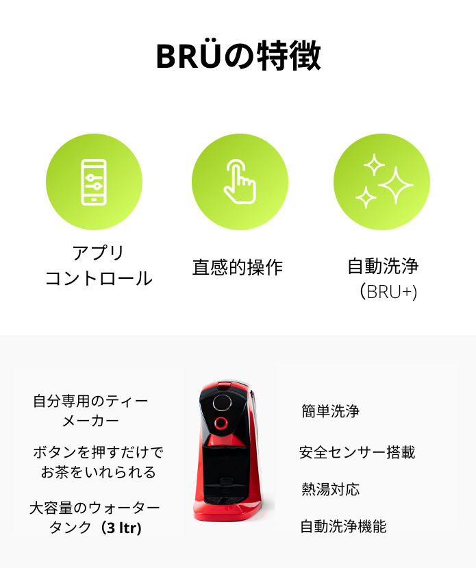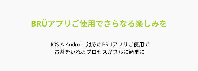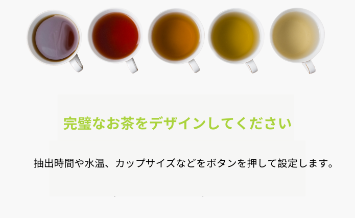 BRÜに搭載されている複数のお茶いれ機能を利用して、お好きな数だけ様々なお茶のアロマをお楽しみいただけます。 お茶をいれる回数ごとに異なる温度、抽出時間、カップサイズを設定し、様々な味をお楽しみください。この機能により、プーアール茶等中国茶をいれる際に洗茶をすることも可能です。