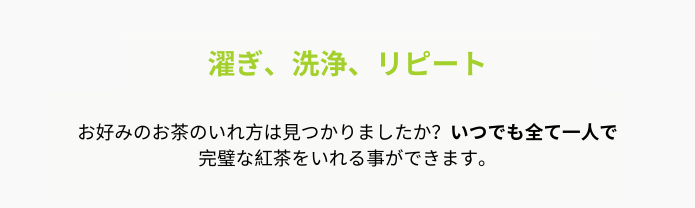 どのタイプの紅茶でも、同じ量の水、同じ濃度で素晴らしい風味をお楽しみ頂けます。 紅茶を淹れる際の障壁を取り除き、お楽しみください。