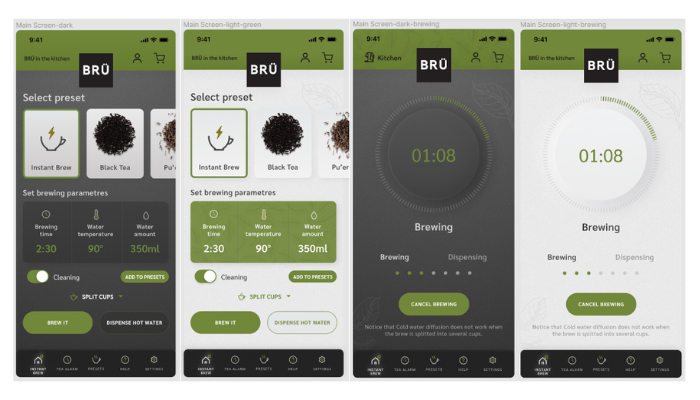 機械の設計を完成させるまでに時間があったので、私たちはアプリのデザインをアップグレードすることに決めました。アプリの最新版のデザインを以下の写真よりご確認ください。アプリにはダークモードとライトモードがございます。私たちの目標はアプリを通してBRÜの操作を楽にし、使い勝手をより良くすることです。もちろん、アプリなしでもマシーンの操作は可能ですが、アプリの使用で複数回のお茶入れ、カップを分け機能などを利用することができるようになります。