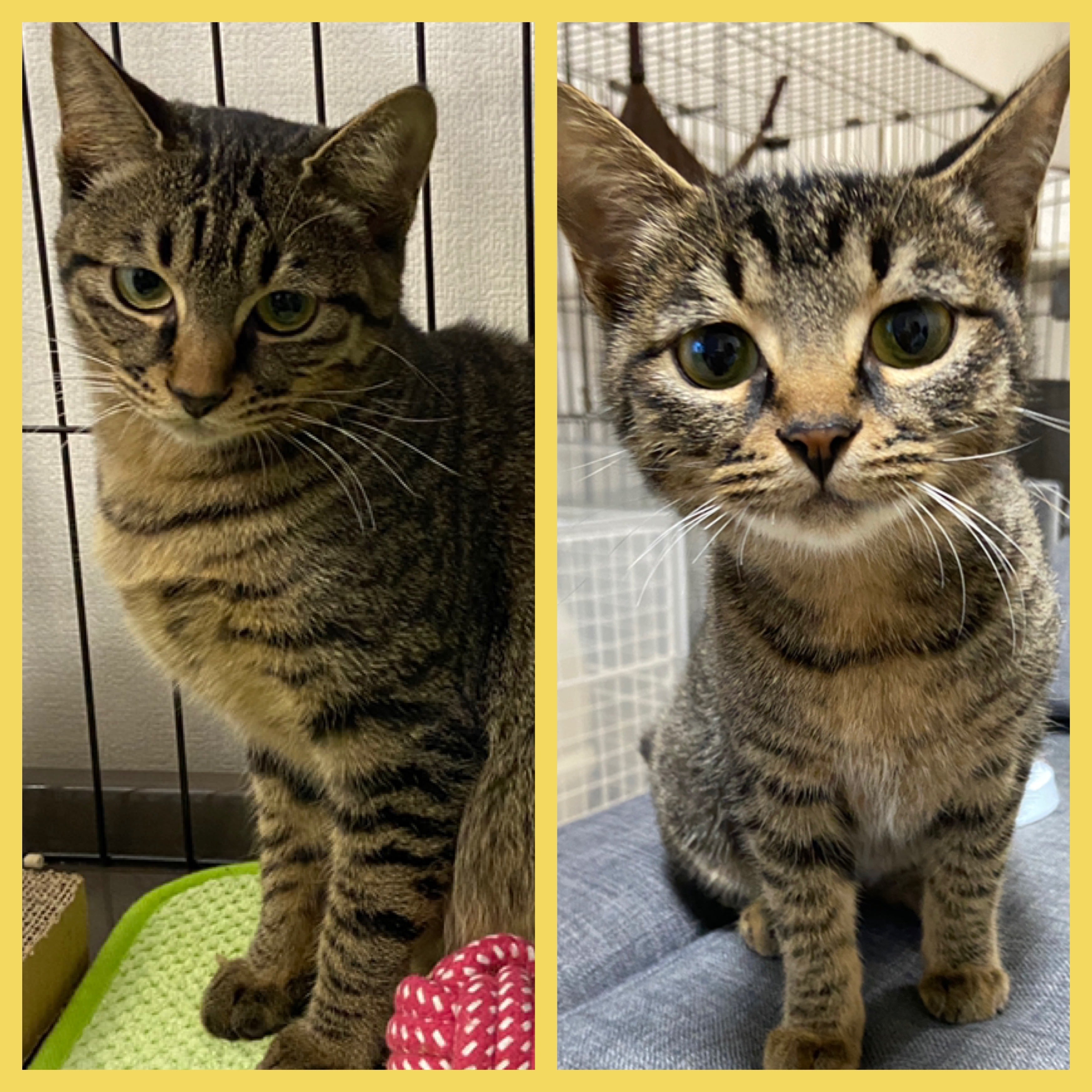 白地にグレーの模様が入った猫と、白地に黒いブチの猫が残っています。