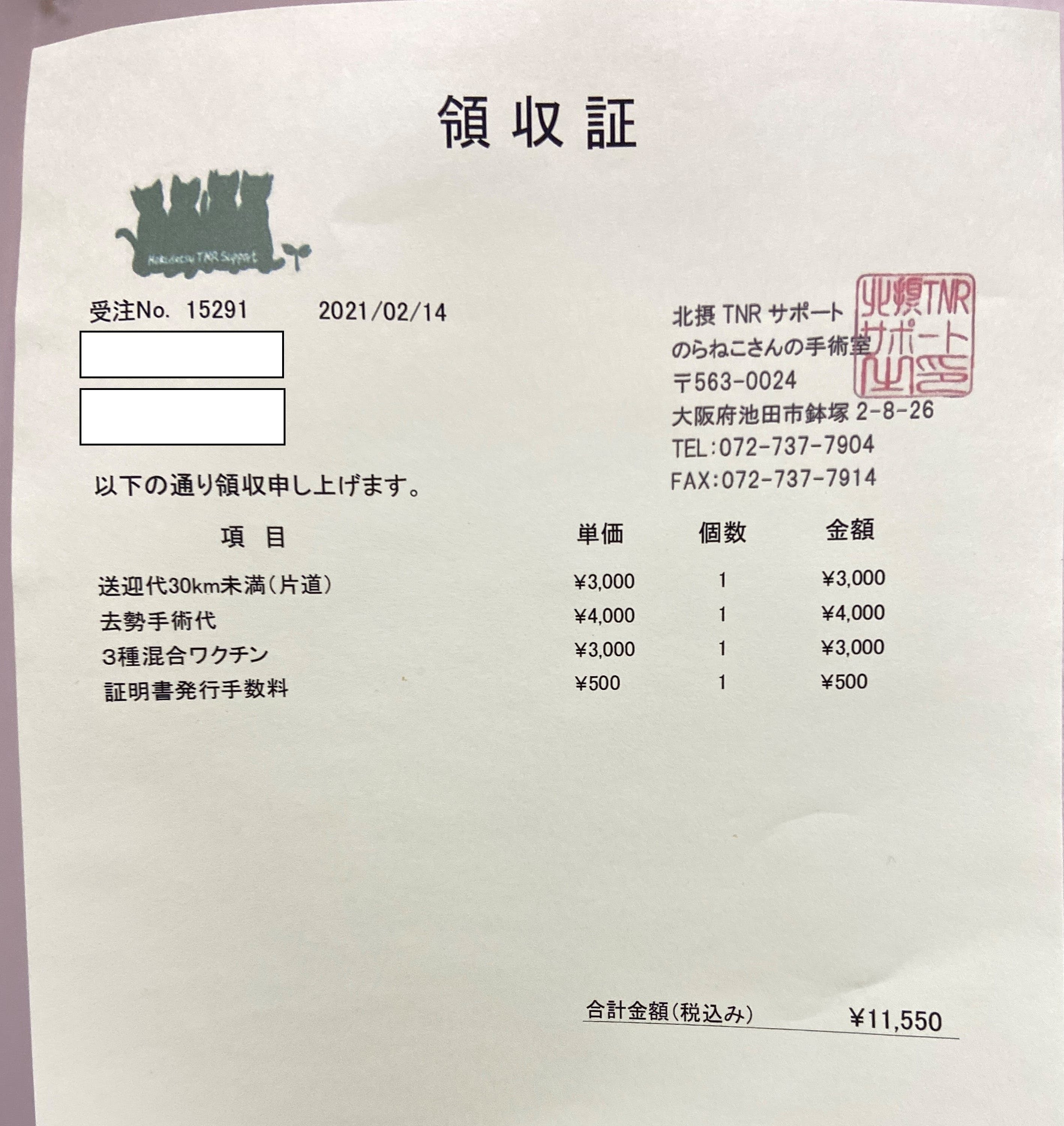 17時に電話で確認すると無事に手術を終えたとのこと。送迎車に乗せられて帰ってきます。費用は11,550円ですと言われて、さすがTNR専門病院安いなぁ(チチの避妊は27000円でした)と思っていたら、あ…れ?