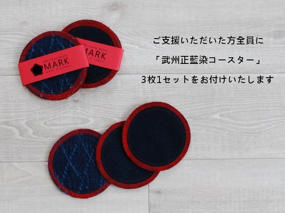 今回、クラウドファンディングでプロジェクトを始めるにあたり 各アイテム、ご支援いただいたすべての方に オリジナルコースターをお届けいたします。 こちらのコースターは武州正藍染で仕上げた刺し子生地を使用しています。 使うごとに本藍の風合いが変化し、経年変化を楽しめます。