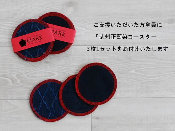 こちらのコースターは武州正藍染で仕上げた刺し子生地を使用しています。