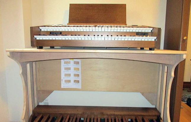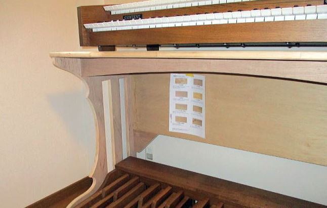 オランダコンテント社のコンパクトタイプの電子オルガンです。音源はパイプオルガンそのものを再現しています。オルガニストや、オルガン愛好家の皆様向けに販売しています。日本の住環境を考慮し、現在は最もコンパクトな機種のみを扱っていますが、コンテント社では様々なタイプの電子オルガンを製造しています。スタンドはスチール製のOEM製品で、他社の供給品です。持ち運びやステージにも使用できる仕様ですが、剛性の点で問題点もあります。お客様の要望も踏まえて、据え置き型の木製のスタンドを揃える必要性を以前から感じていました。