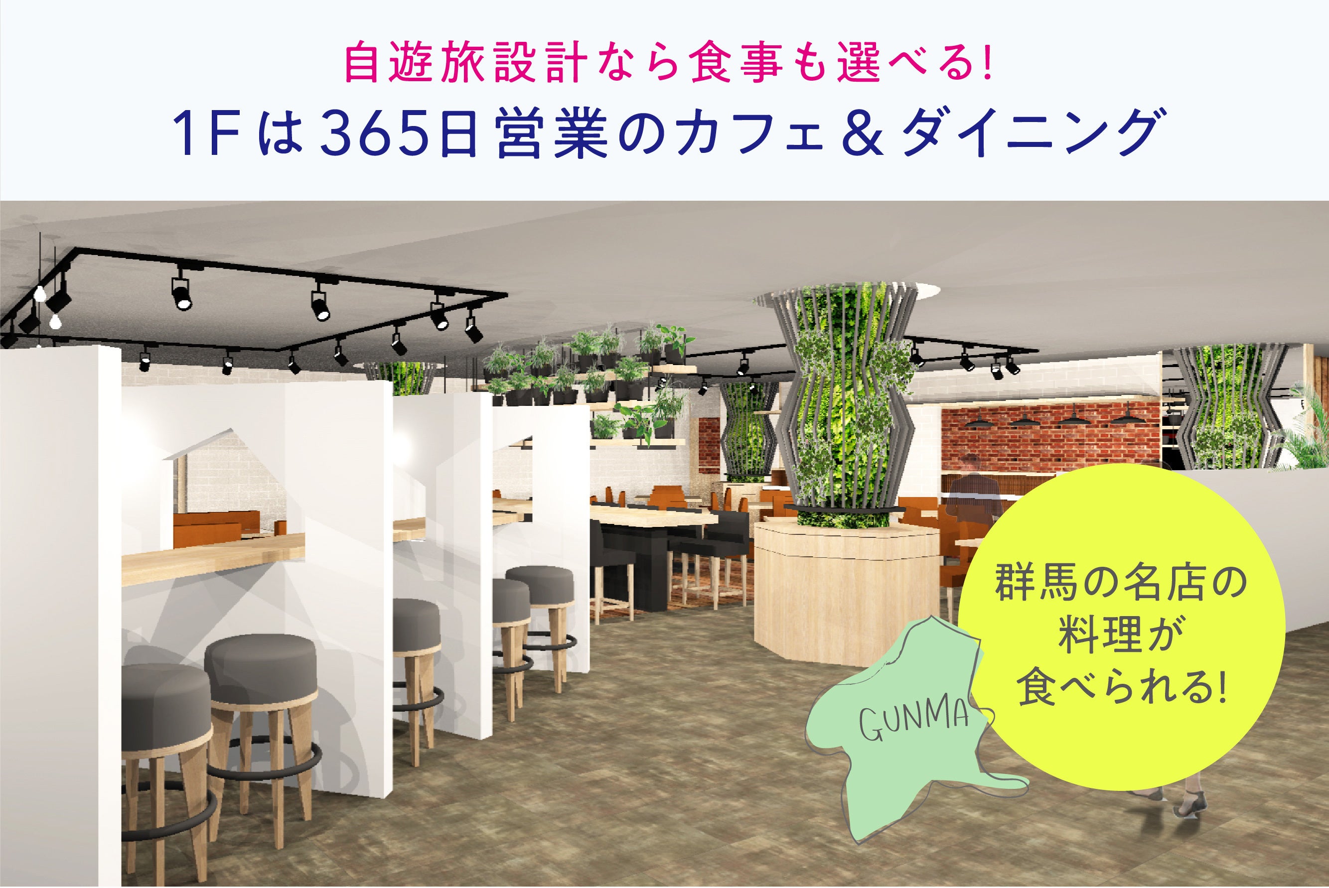 ルルドの1Fは広々としたカフェ&ダイニングになっていて、そこでは群馬の名店が様々なジャンルの料理を提供してくださる予定です。もちろん滞在の際はここで食べなくても温泉街に出かけたり、グランピング施設でBBQランチをしたり旅館で会席料理を食べてもいい。何日滞在しても飽きない、選ぶ楽しさがある。私が提供したいのは滞在の仕方も食事も、「選ぶ楽しさ」です。