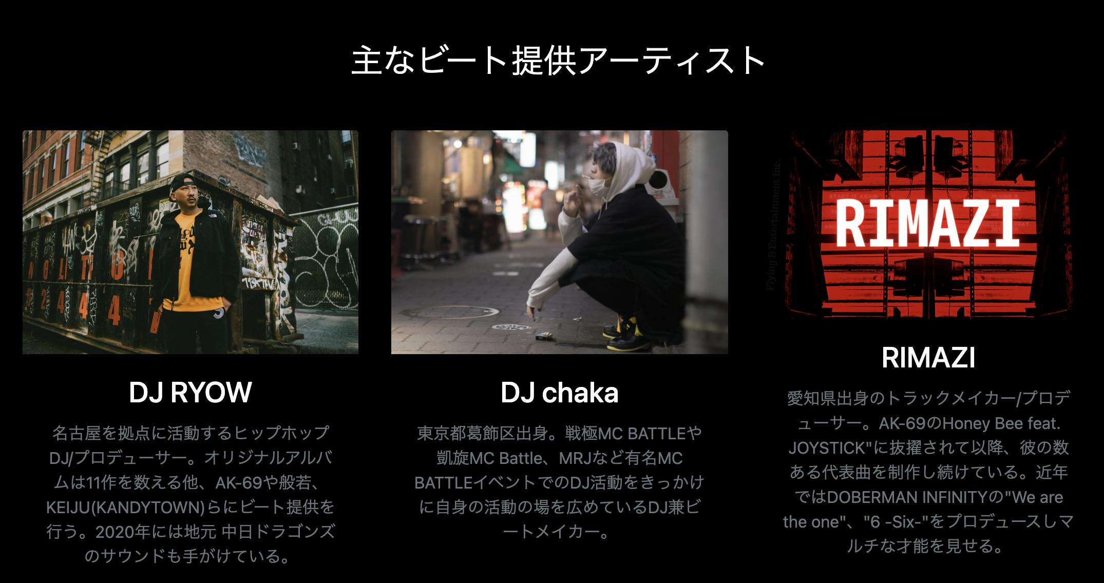 名古屋を拠点に活動するヒップホップDJ/プロデューサー。オリジナルアルバムは11作を数える他、AK-69や般若、KEIJU(KANDYTOWN)らにビート提供を行う。2020年には地元 中日ドラゴンズのサウンドも手がけている。
