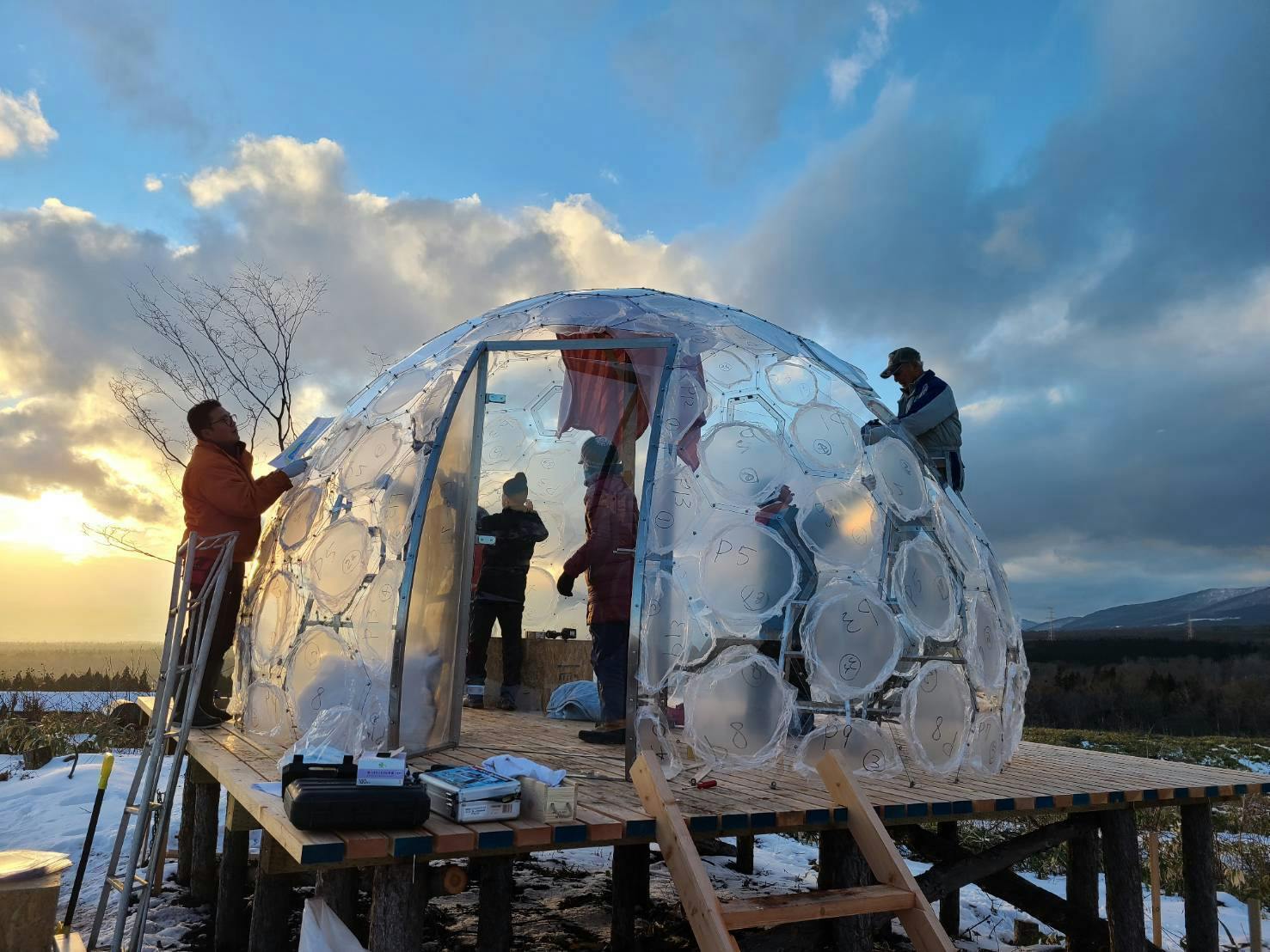 2020/12/23 16:10昨日12月22日朝8時から日没18時までかかって、透明ドームテント1基を設置いたしました!ボランティアさん総勢5名集まっていただきました。ありがとうございました!最初は透明の板だったものがつなぎあわせてドームになる。今回のグランピングエリアがゼロから出来上がる様を表しているかのような気持ちになりました。途中、夕焼けが沈むのを見ながら作業をしていましたが、これがなかなかダイナミックな景色を見れます。そして夜にはお月さまと星が。18時ですでにお月様と星が見えますから、夜になるにつれてもっともっと素敵な星空が見れることは間違いありません。ただ!!今回は外枠の透明ドームテントが設置できたまでで、トイレやシャワーなどの付帯施設と調度品の設置も必要です。みなさまのご支援をぜひよろしくお願いいたします。この透明ドームテントでの宿泊は自信を持ってオススメできます。朝日・夕日・月・星、自然の偉大なるコンテンツをお楽しみください♪【最初は透明の板からスタート】【まずは入口から設置(ドラえもんのどこでもドアのよう?!)】【最初は底から板を貼り合わせていきます】【だんだん形になっていきます】【天井は床からジャッキで持ち上げて設置します】テント越しの夕日をご覧ください!!!【日没はこの暗さ。これで18時です。満点の星空が見れることは間違いなしですよね!】【完成!】いかがですか?こんなテントに泊まったことはないのではないでしょうか?ペット、里の保護犬たちと一緒に泊まりにいらしてください♪ もっと見る