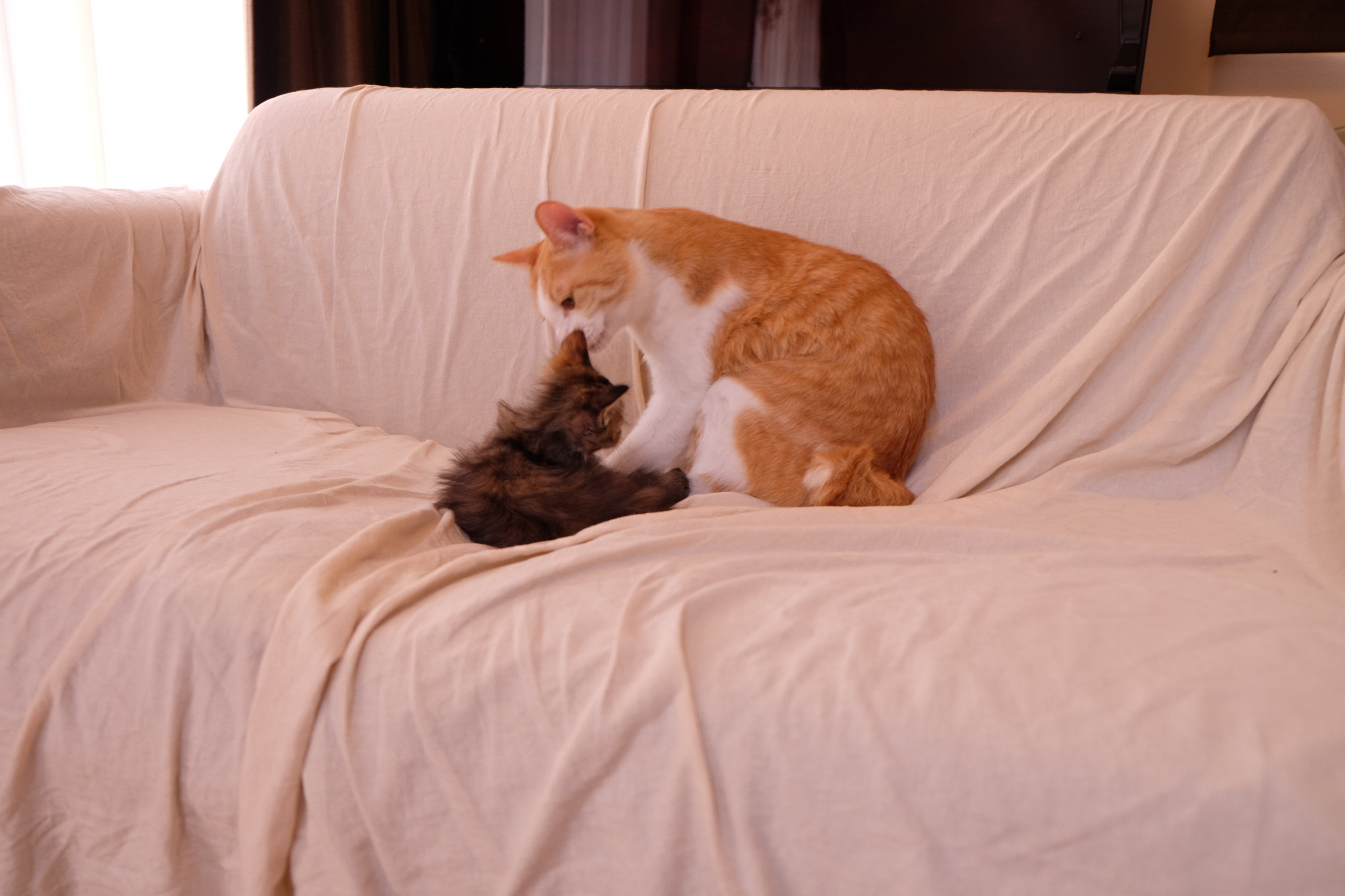 夏に新入りの子猫の「よもぎ」が来た時には、少しだけうなったあと、すぐに受け入れて、一緒に添い寝したり、せっせと毛づくろいをしてはよもぎの毛をベトベトにしていた優しい猫でした。