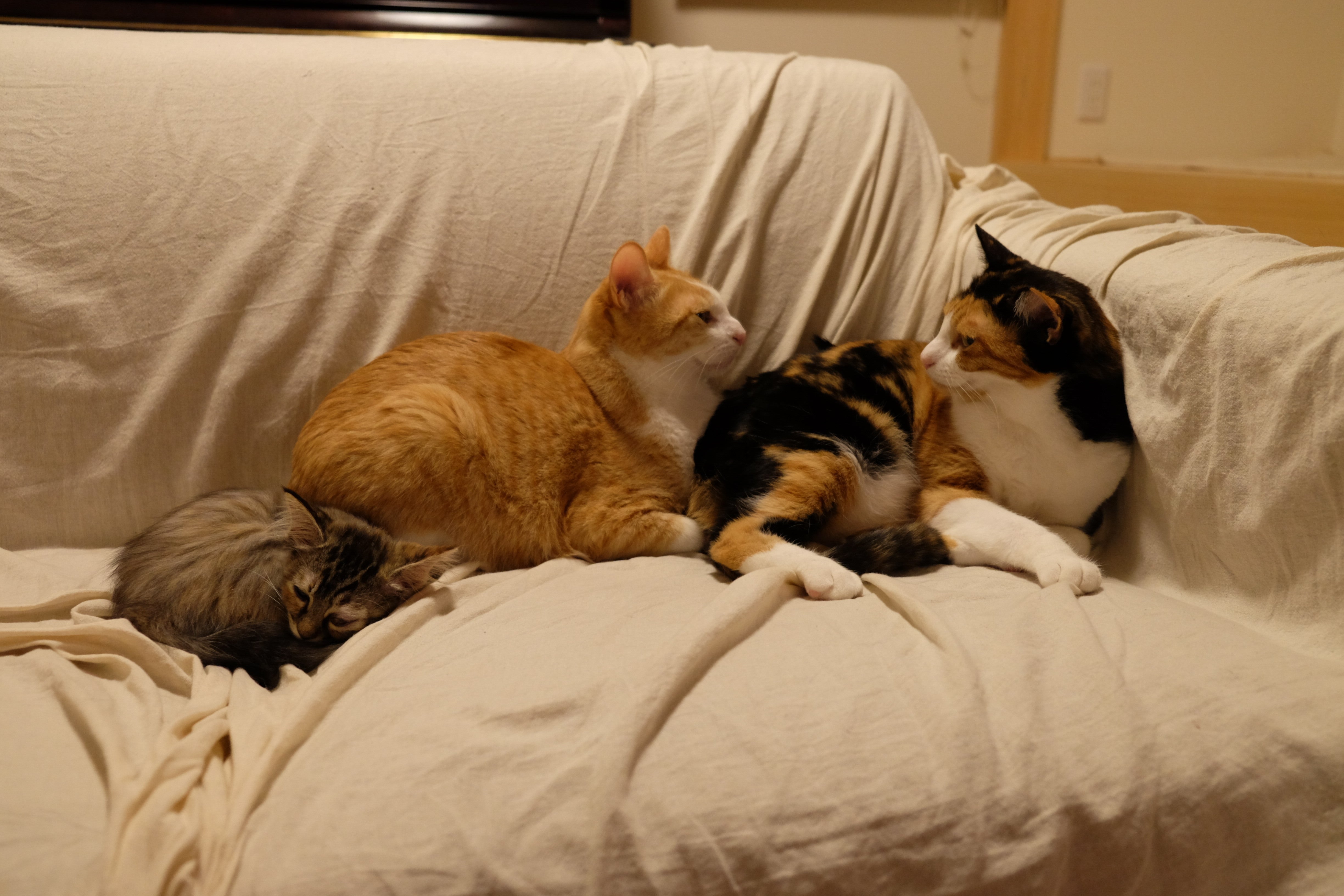 そして今年の夏からは、同じく保護猫出身の片目の子猫「よもぎ」も加わり、我が家で3匹と2人、穏やかに暮らしていました。