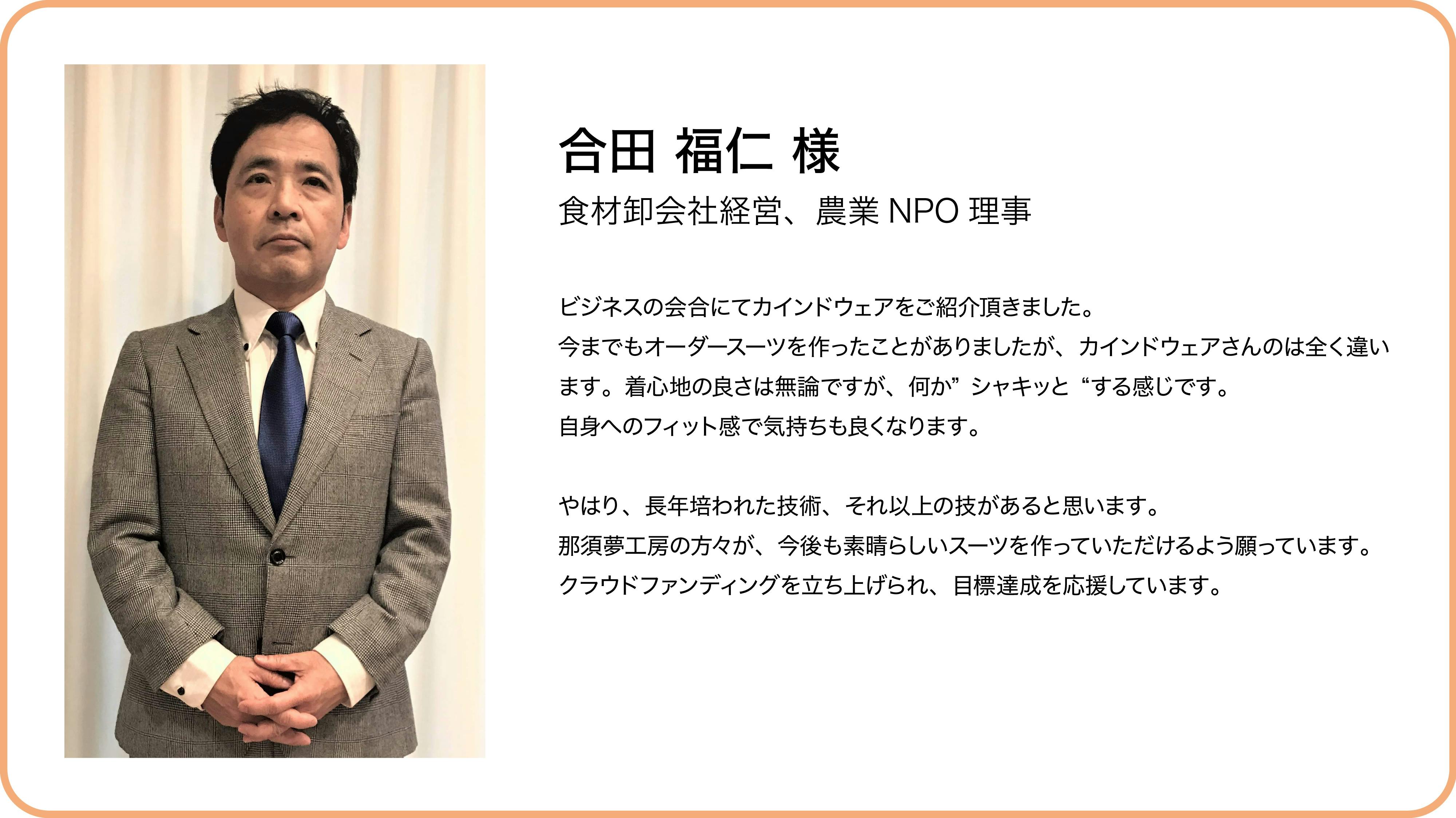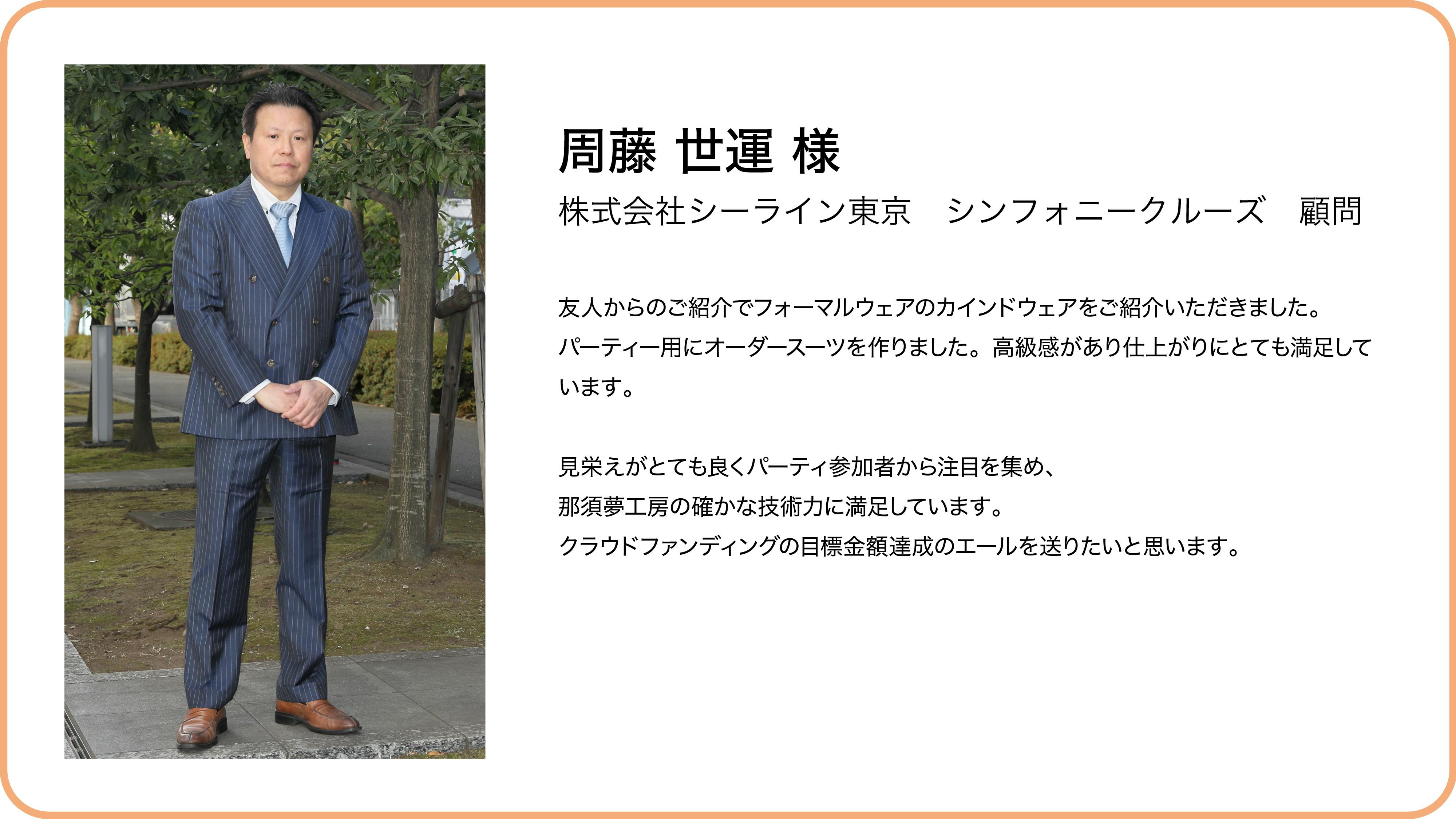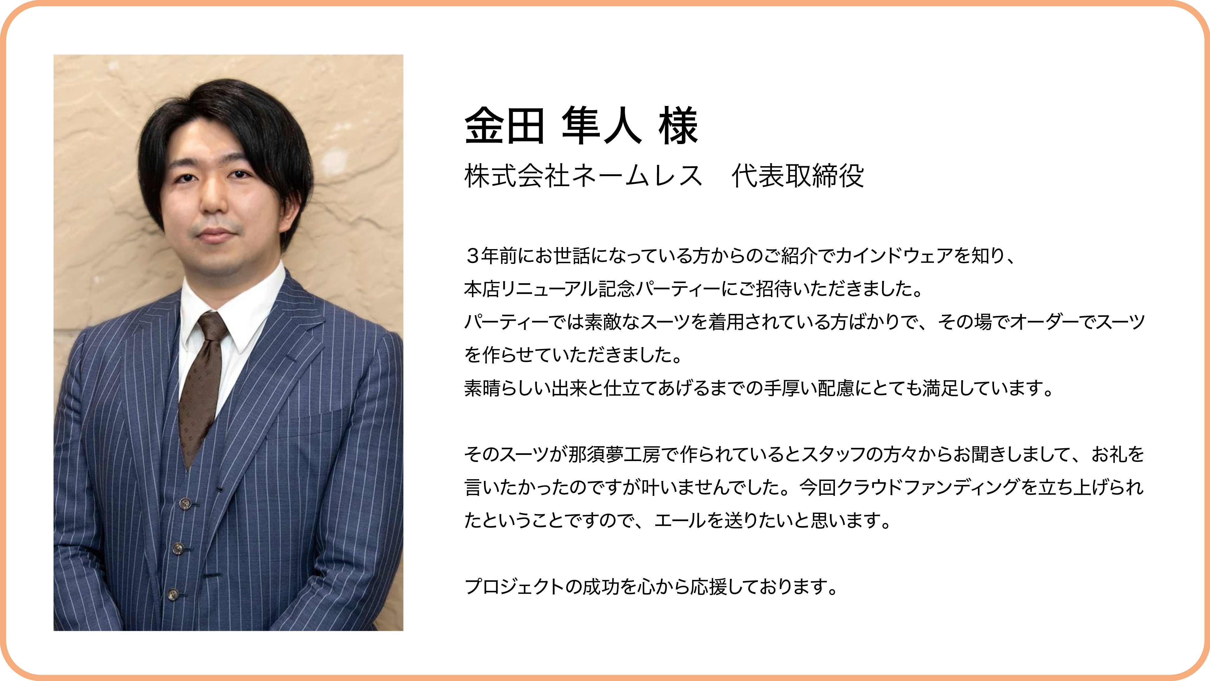 従業員の雇用を守るだけでなく、今まで受け継がれてきた縫製技術やスーツの文化を未来へ残すため、ご支援を是非お願いいたします。
